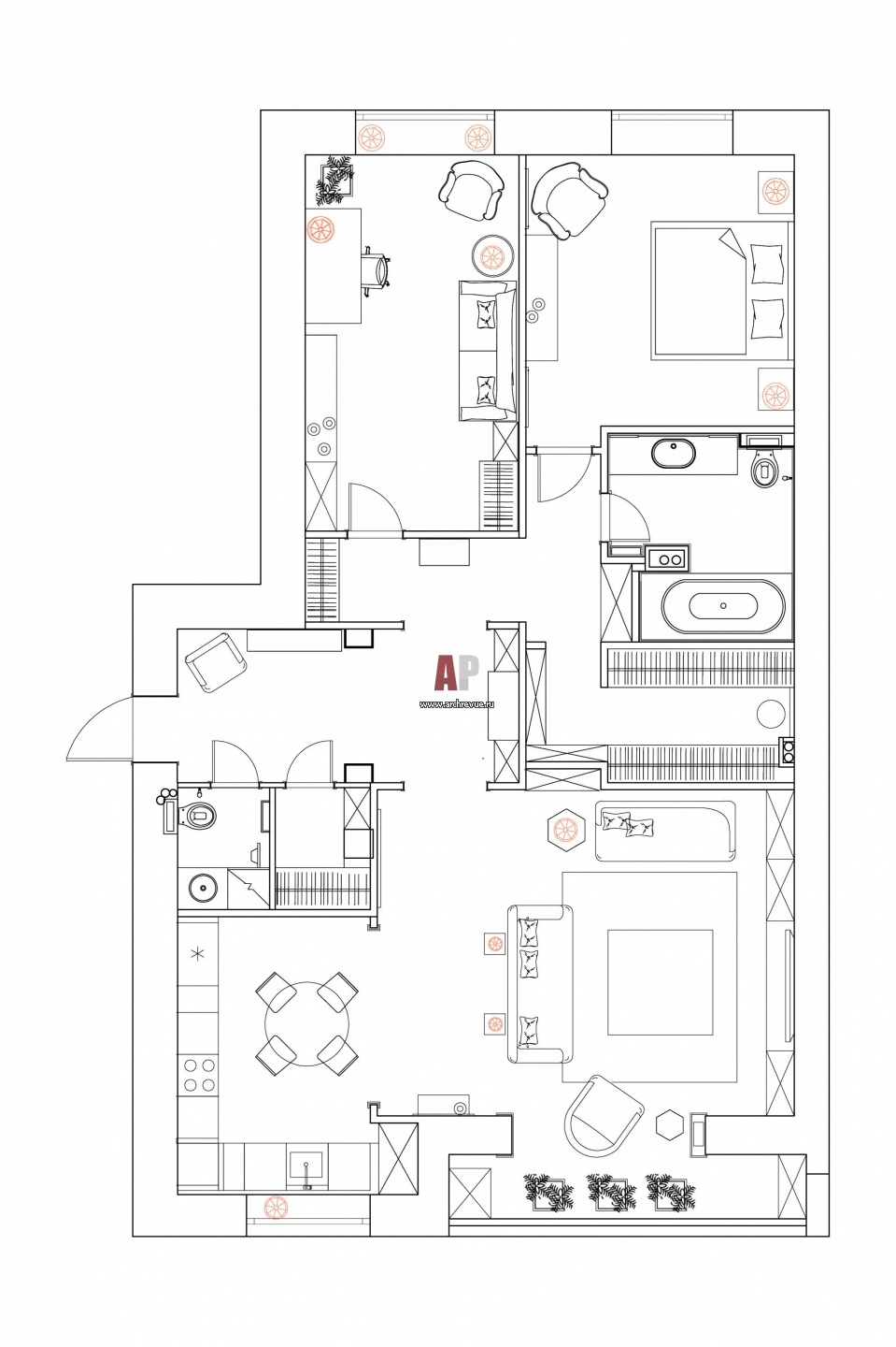 План трехкомнатной квартиры с опен-спейс гостиной. Общая площадь – 100 кв. м.