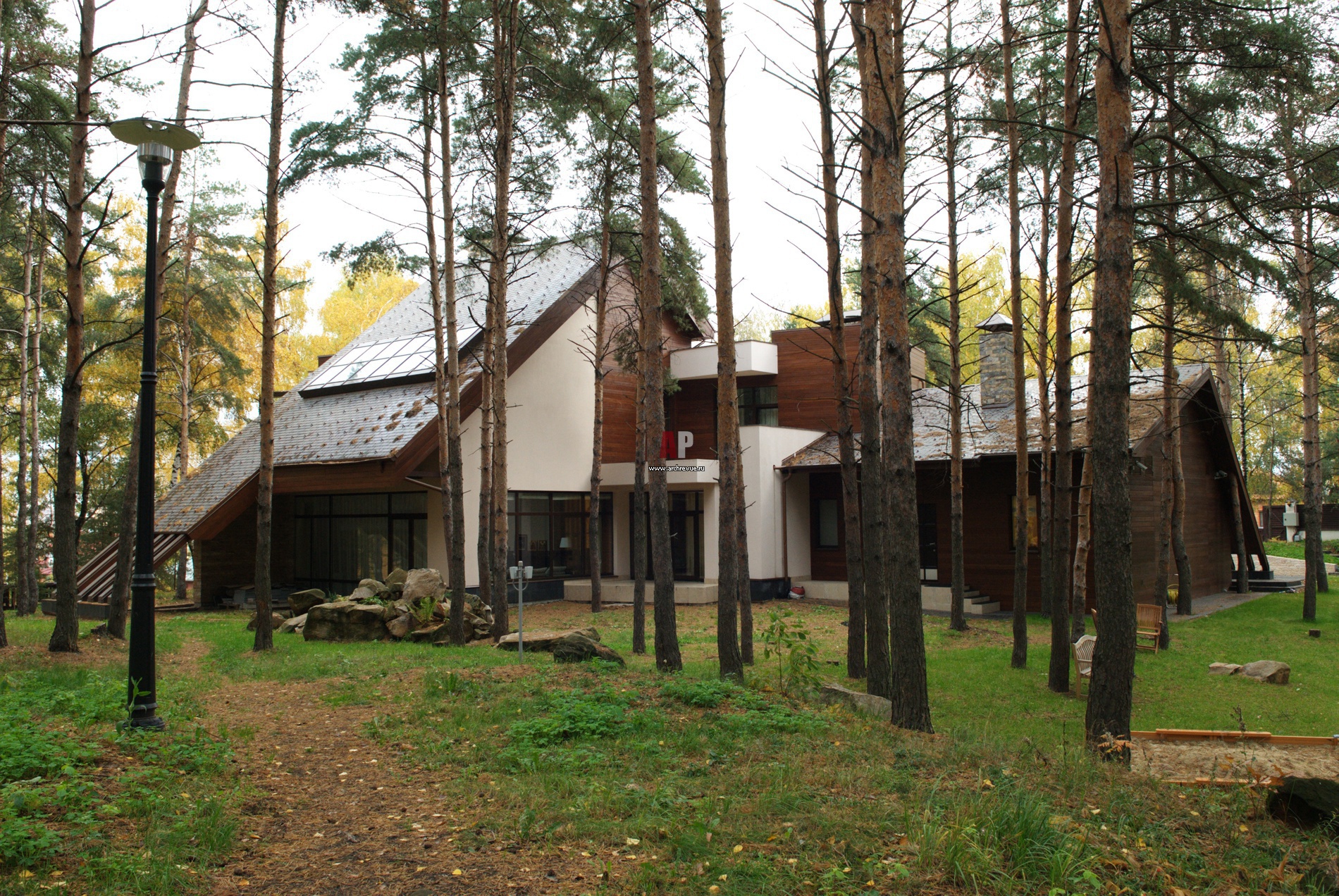 Фасад, обращенный на участок. Дом набран из тех объемов. Центральная часть имеет плоскую кровлю. На ней обустроена открытая веранда. Фасад зашит панелями из тонированной сосны.