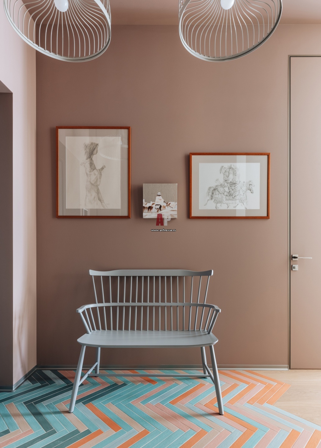 Прихожая. Дверь-невидимка ведет в приватный блок. Лавка, FDB Mobler. На стене – графика Наны Татишвили из коллекции заказчицы.