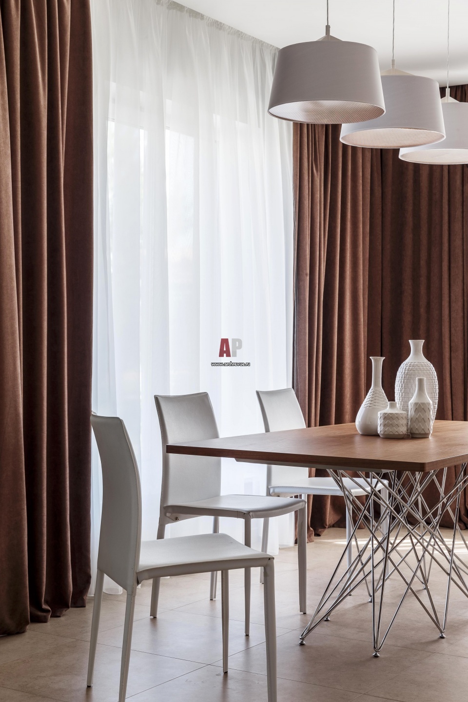 Интерьер столовой в стиле минимализм. Основание обеденного стола выполнено из перекрещенных тонких металлических труб, столешница – массив ореха. Светильники над столом, Rotaliana.