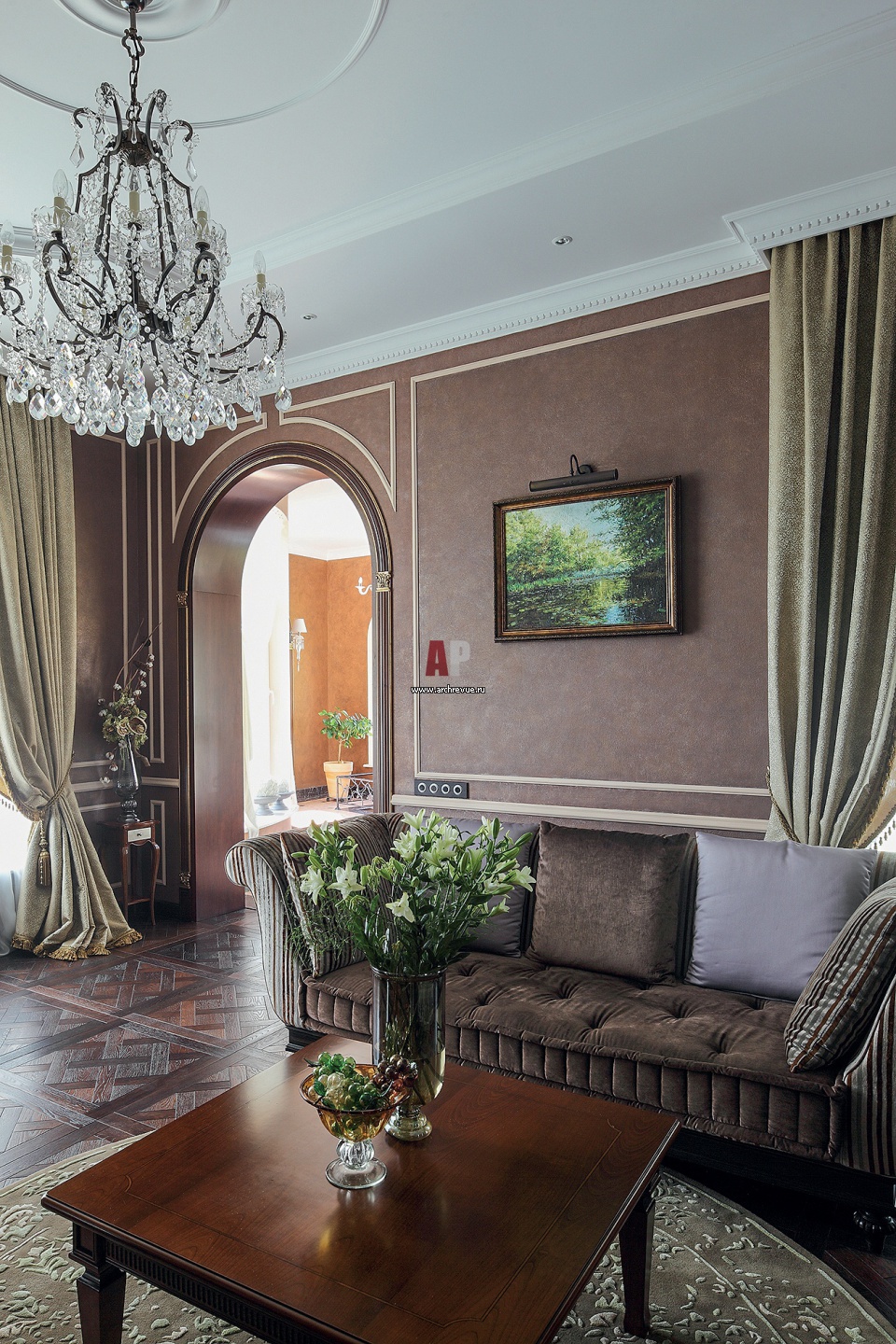 На фото – интерьер гостиной в духе современной классики. Стены оформлены декоративной штукатуркой сложного серо-лилового с фактурой камня.