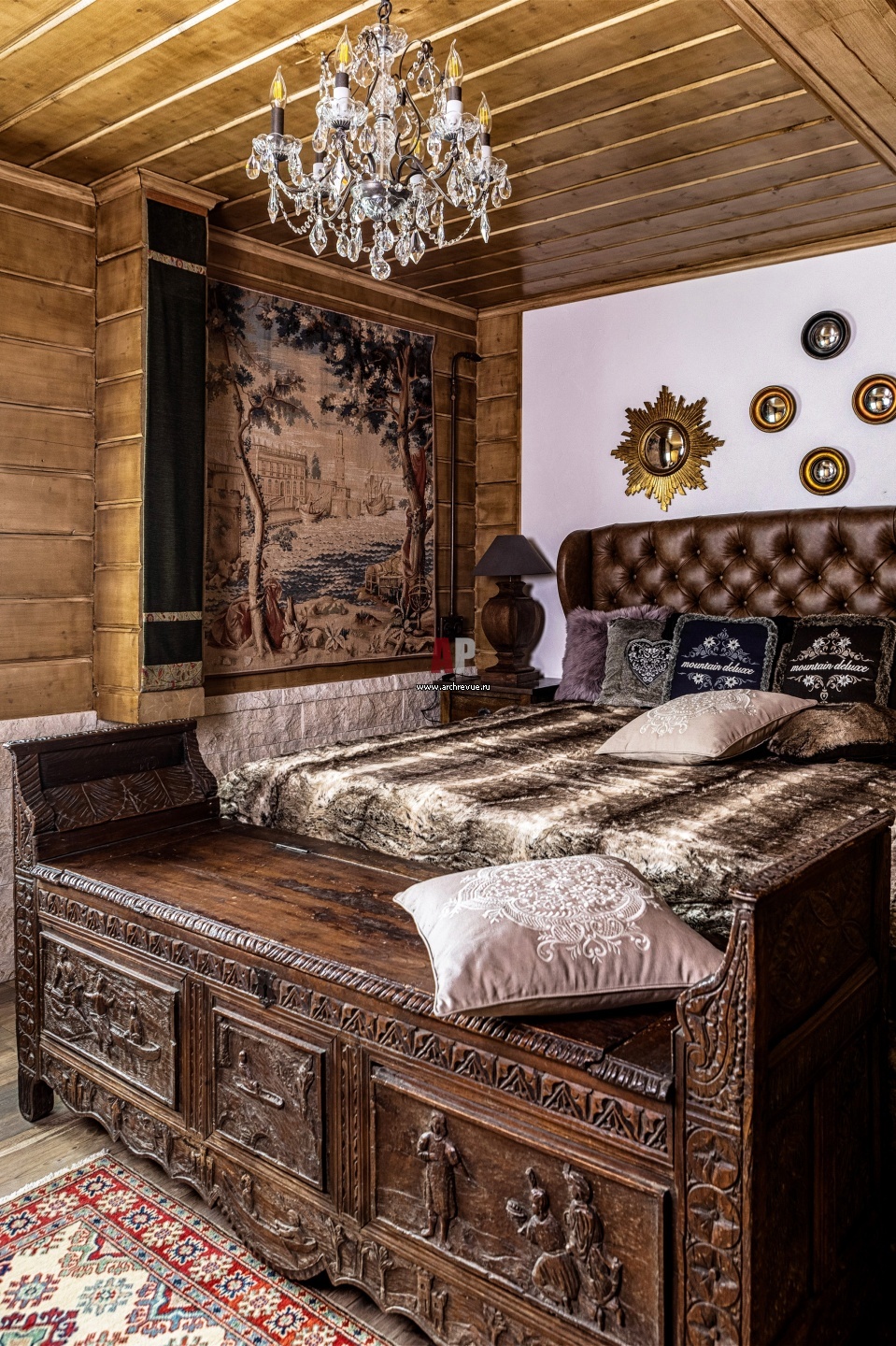 Дом-шале с историческим шармом. Интерьер хозяйской спальни. Гобелены привезены из Франции и Бельгии. Кровать и сундук – антикварные с ручной резьбой. Они куплены во Франции.