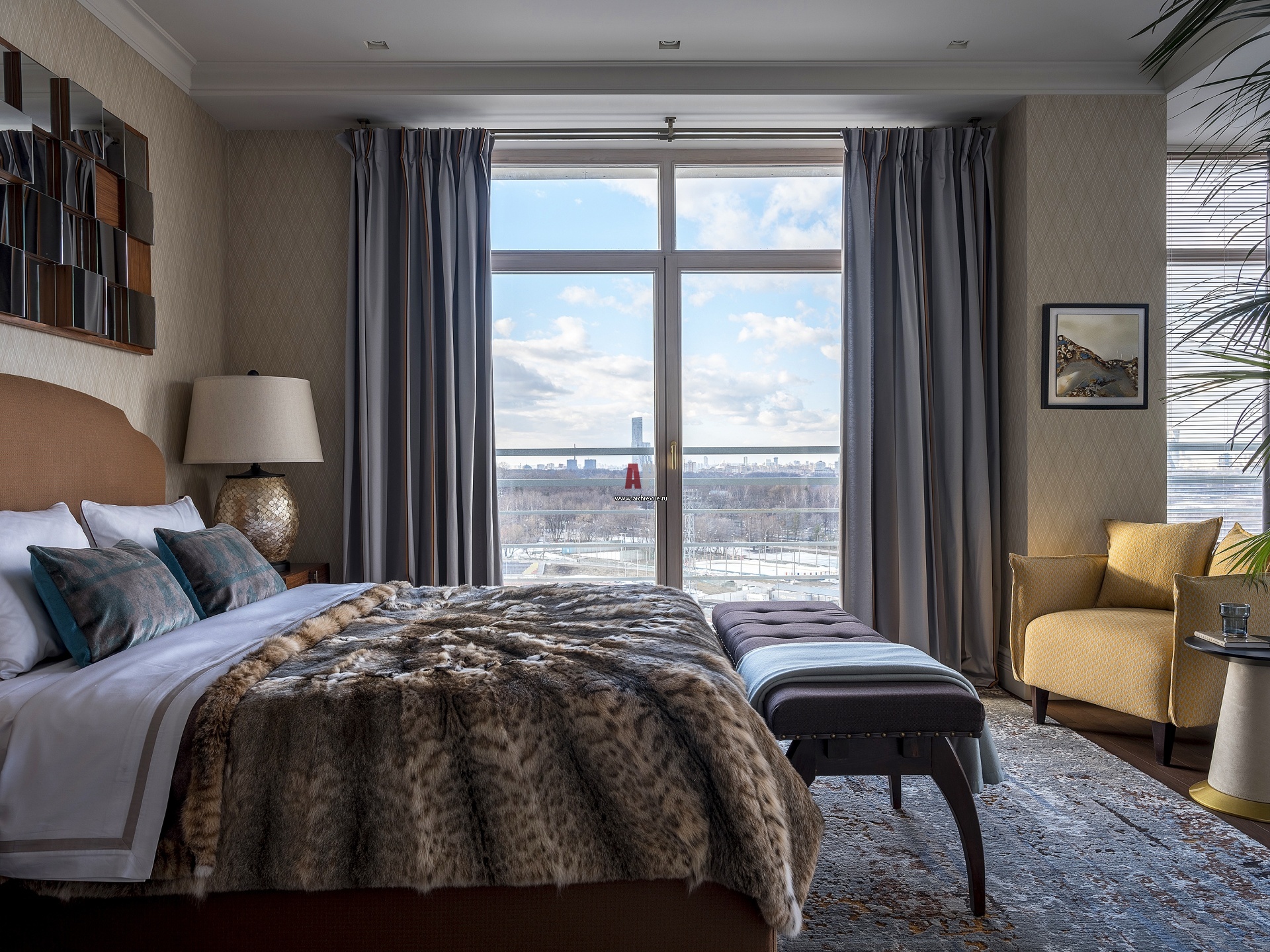 Все главные помещения в квартире (опен-спейс, спальня и кабинет) расположены вдоль главного фасада и имеют панорамные окна, благодаря чему уникальные виды становятся полноправными участниками интерьера.