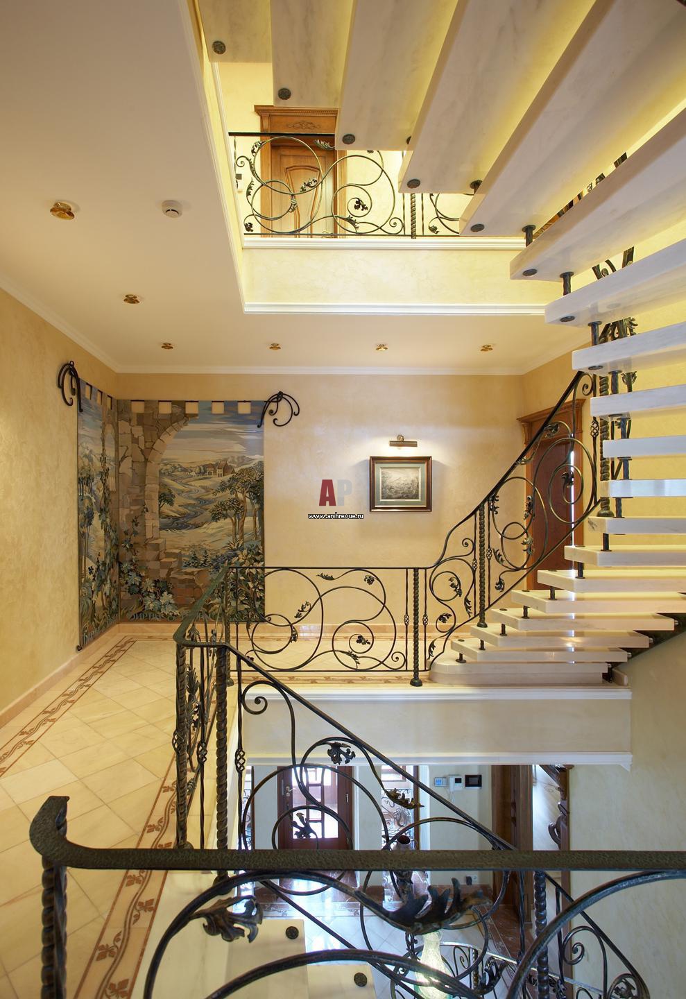 Лестница – одна из главных осей в пространстве этого дома. Невесомая, прозрачная, оплетенная тончайшим кованым ограждением, она связала все интерьерные решения этого дома.