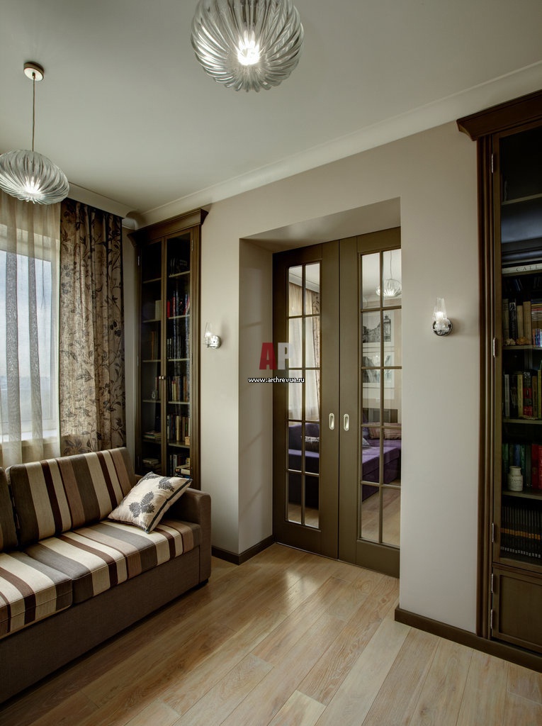 Фото интерьера помещения библиотеки. По обе стороны от раздвижной двери встроены узкие книжные шкафы.