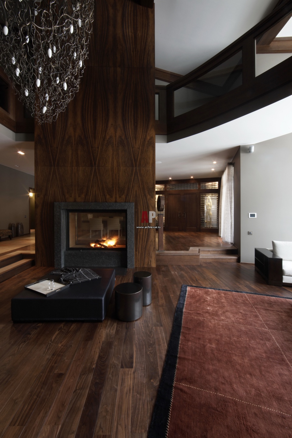 Вертикальная доминанта двухсветной гостиной – камин. Его топка облицована гранитом, а дымоход зашит панелями из африканского дерева с красивой фактурой. Работы по дереву, «Мастерская стильной мебели».