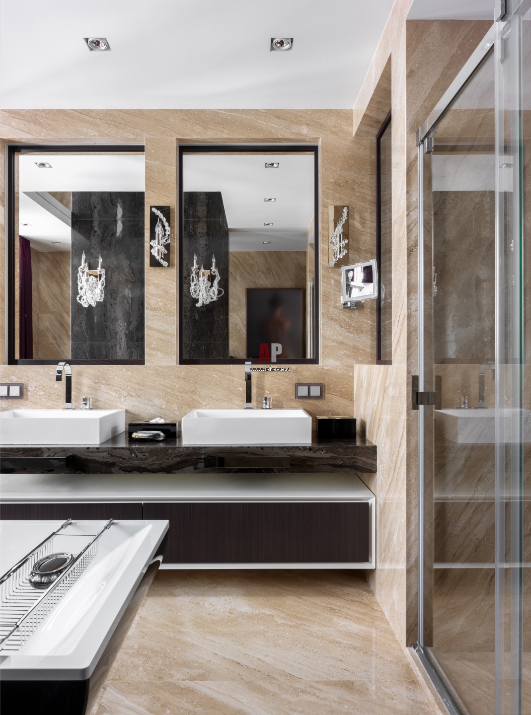 Хозяйская ванная комната. Стены и пол – светлый камень Daina. Темные поверхности — мрамор Cappuccino. Раковины, Antonio Lupi. Смесители, смесители Dornbracht. Светильники, Brand van Egmond.