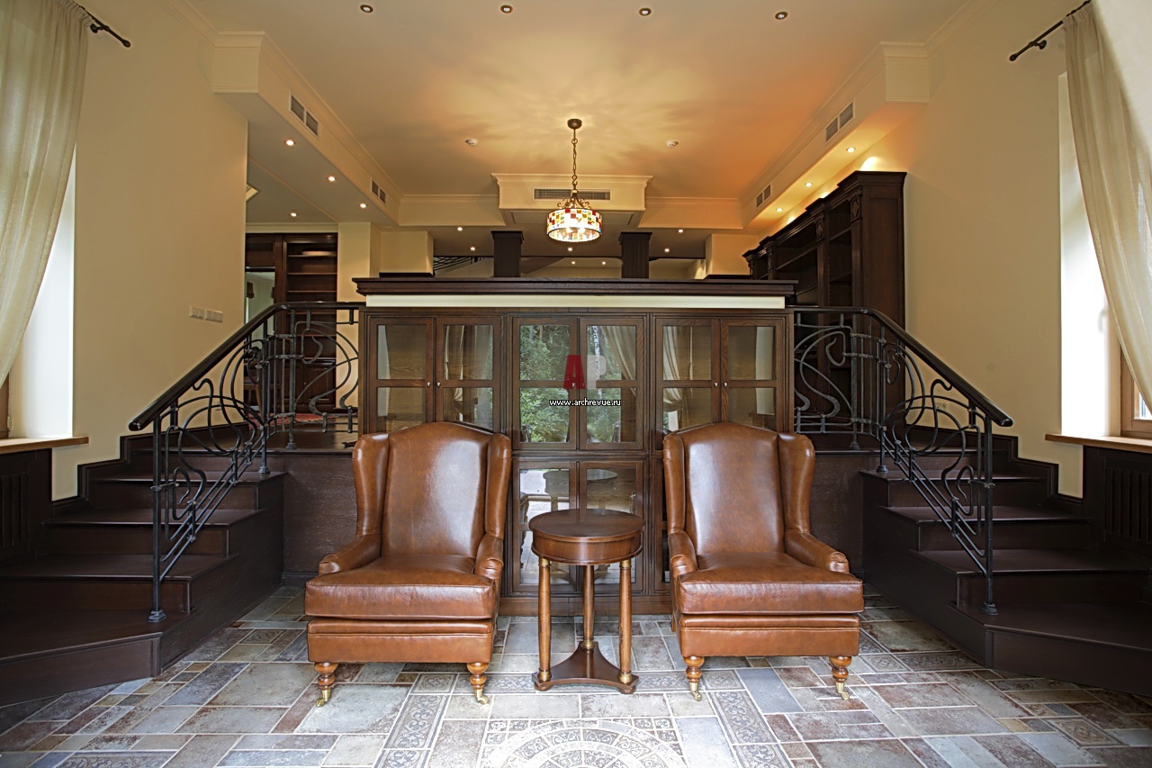 Зона отдыха в общем пространстве. Несколькими ступенями выше – библиотека, ниже – выход в сад.