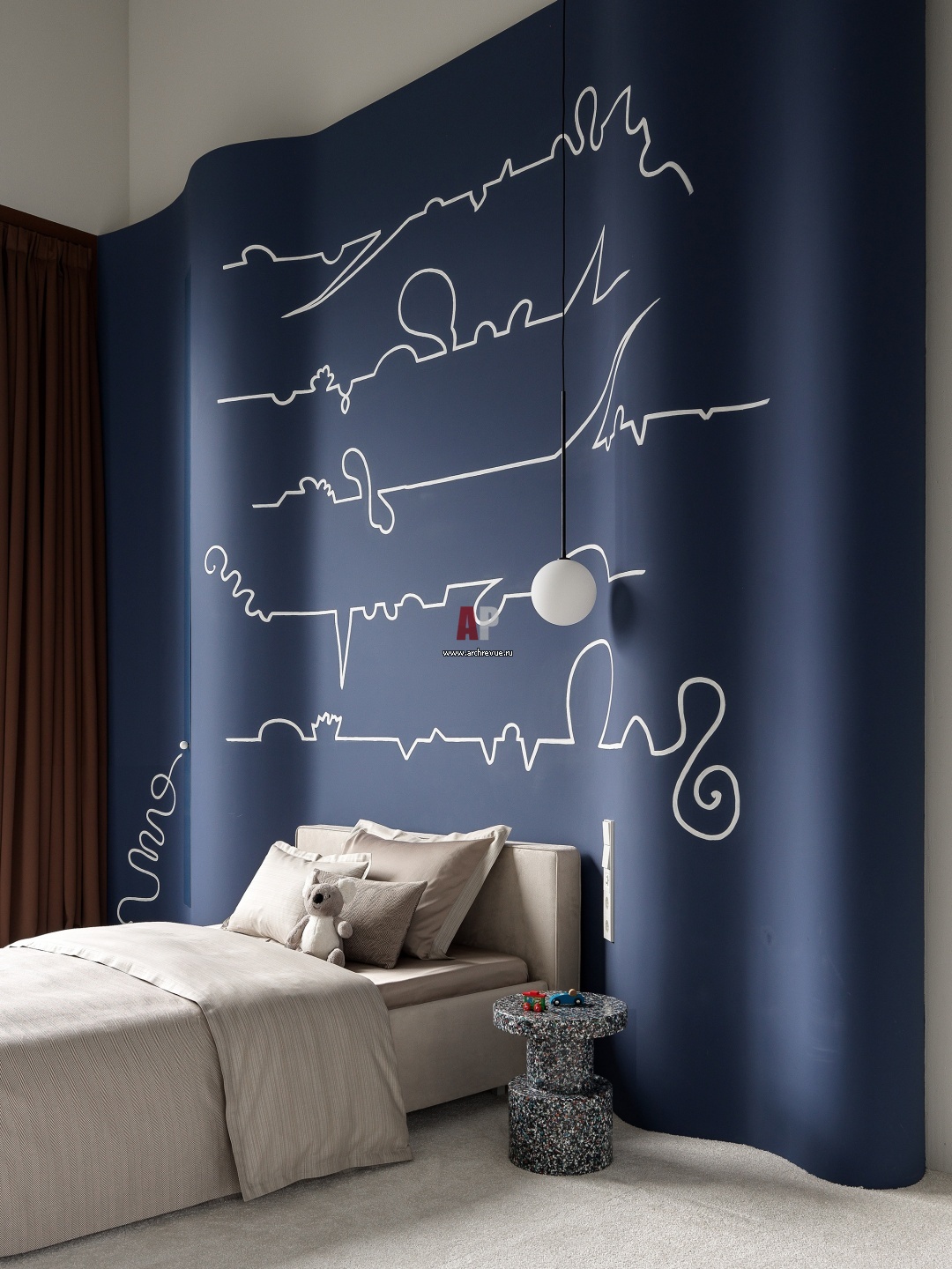 Детская спальня. Стена-«кулиса» за кроватью сына выкрашена в глухой синий цвет и декорирована рисунками в духе мифологии Лоренса Стерна.