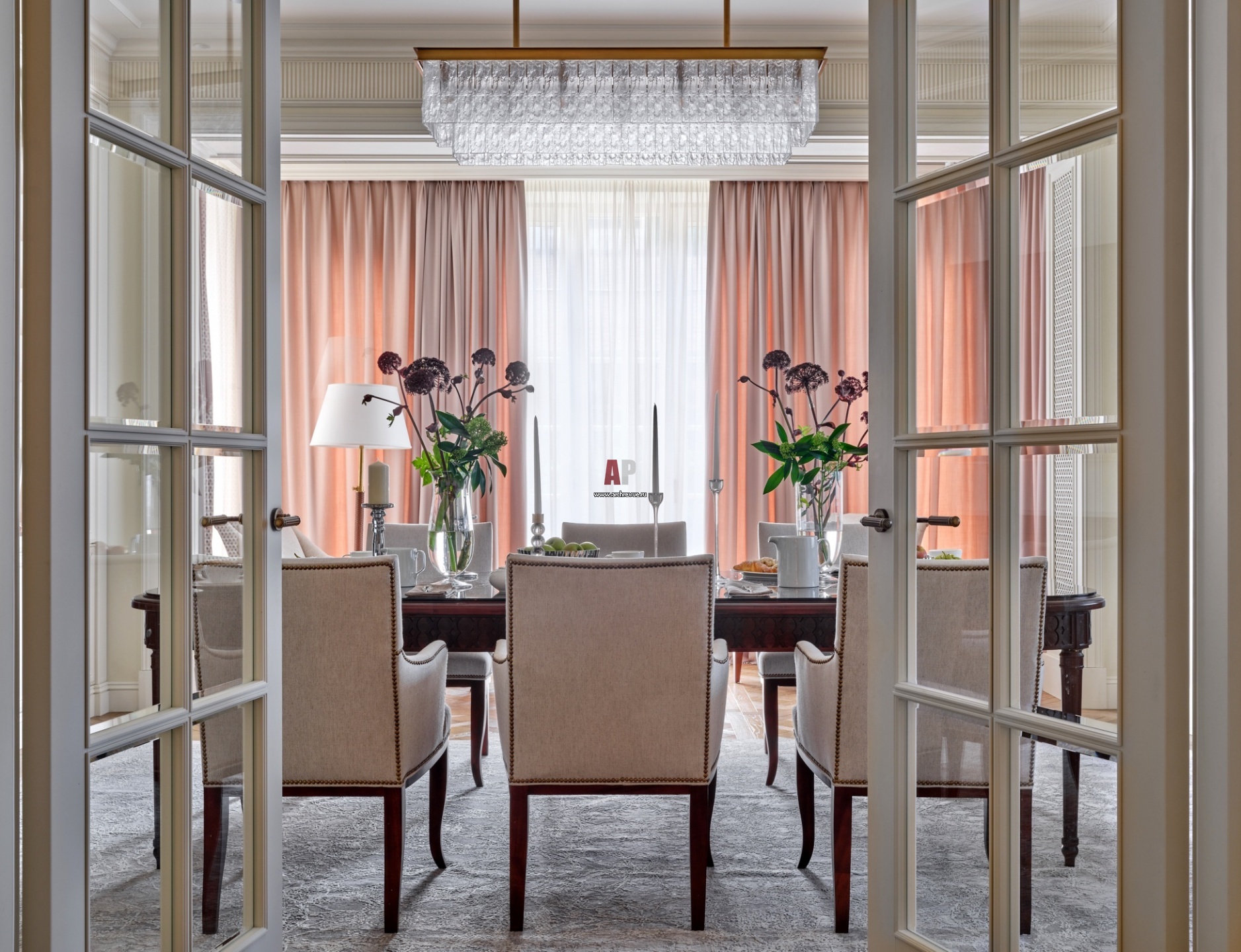 Вид на столовую из холла. Распашные двери с расстекловкой выполнены в классическом стиле с отделкой белой эмалью.