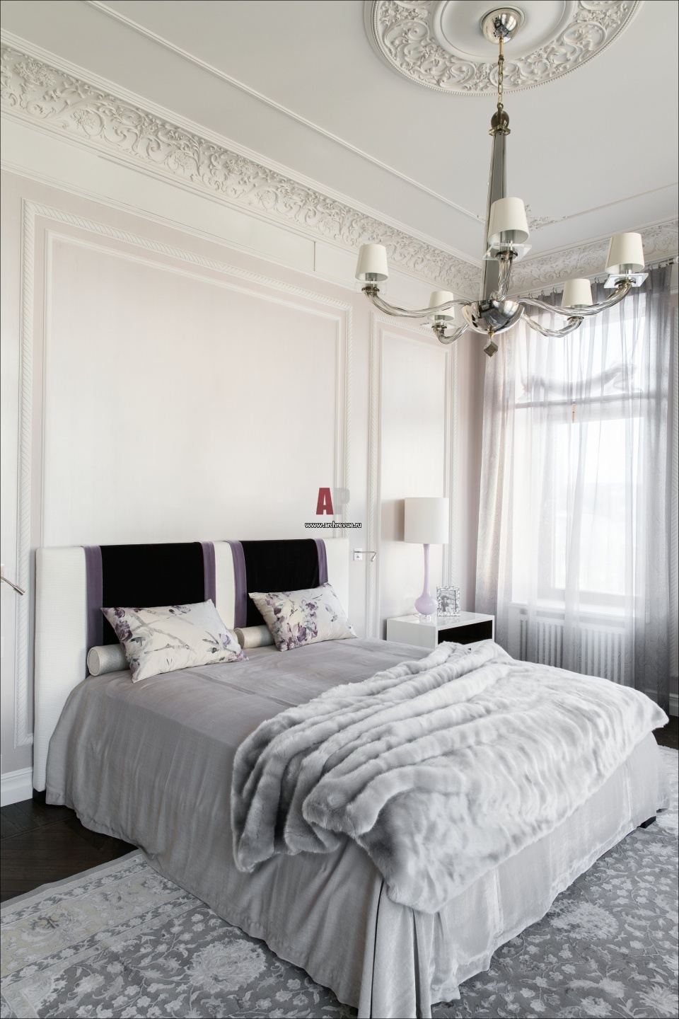 Хозяйская спальня выдержана в спокойной классике и светлой гамме с лиловыми и темными лавандовыми акцентами. К ней примыкает большой будуар.