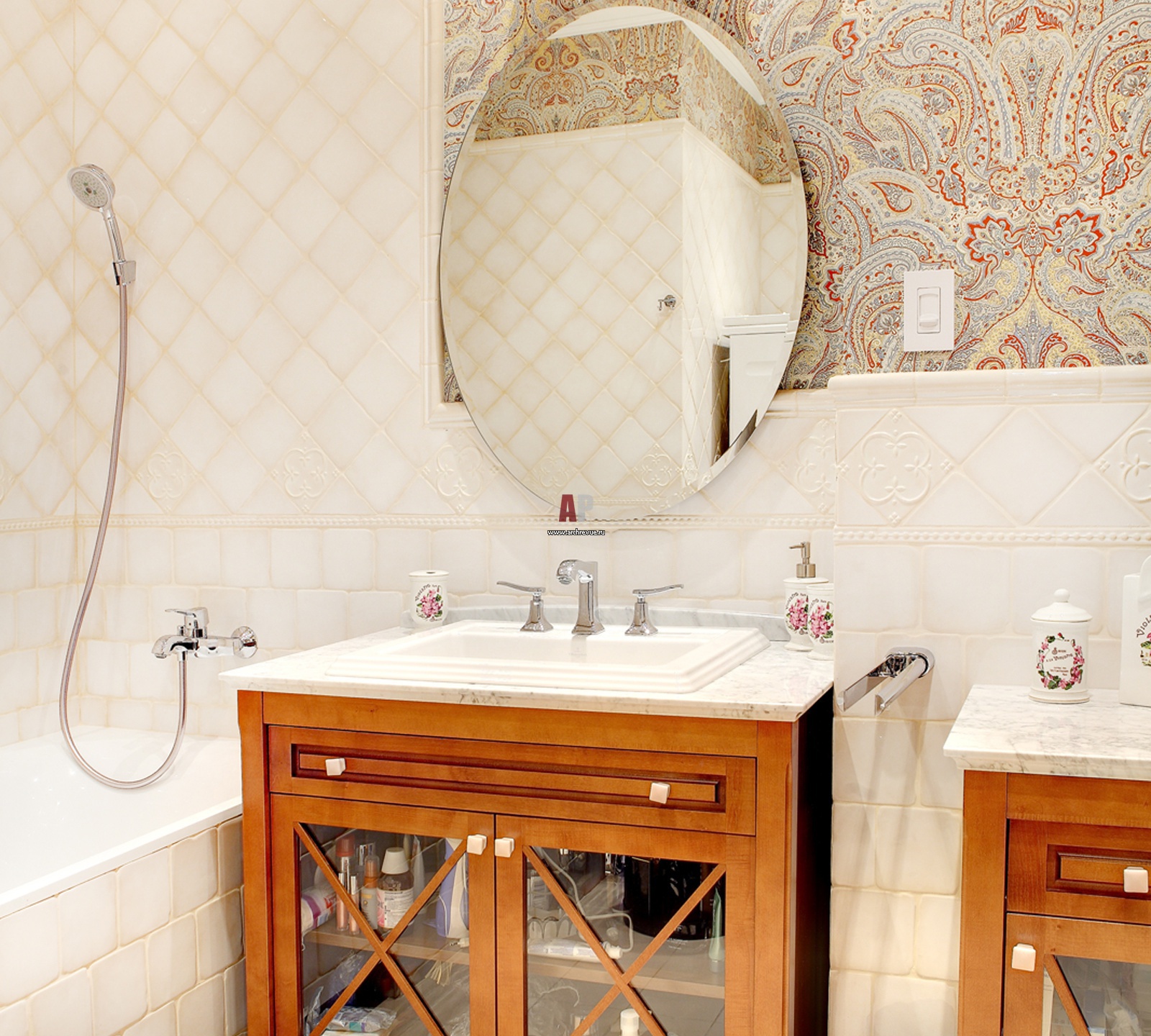 Фото интерьера санузла в неоклассике. Интерьер санузла решен декоративно во многом благодаря обоям с орнаментом «турецкий огурец» и шторам-компаньонам, поставщик «Интерьер Компании».