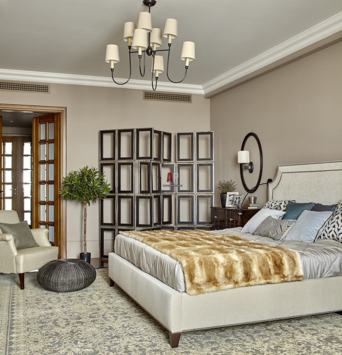 Интерьер спальни в припыленных тонах. Кровать, Vanguard Furniture. Тумбы, Selva. Аксессуары, Crate and Barrel. Ширма работы дизайнера Келли Хоппен, Home Concept.