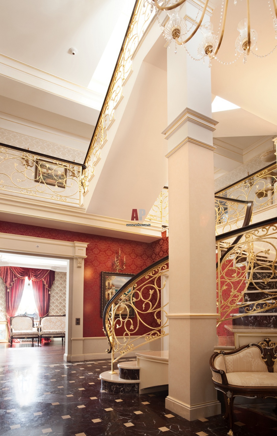 Интерьер двухсветного холла с парадной лестницей. Пол облицован полированными мраморными плитами с инкрустацией. Несущие колонны декорированы лепным декором Orac Decor. На стенах – красные текстильные обои.