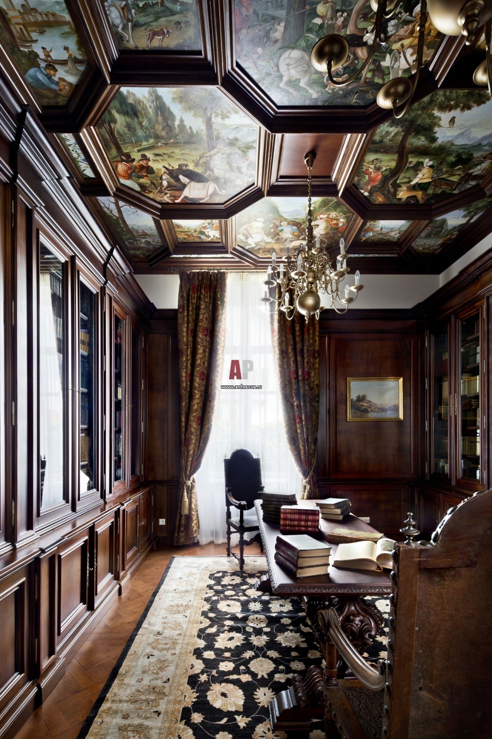 Декоративный акцент интерьера библиотеки – модульный потолок, украшенный авторскими росписями. Сюжет росписей – жанровые сценки – копия росписи плафона рыцарского зала немецкого замка Вайкерсхайм художника Бальтазара Катценбергера. Кресла, антиквариат, XVIII век, Нидерланды.