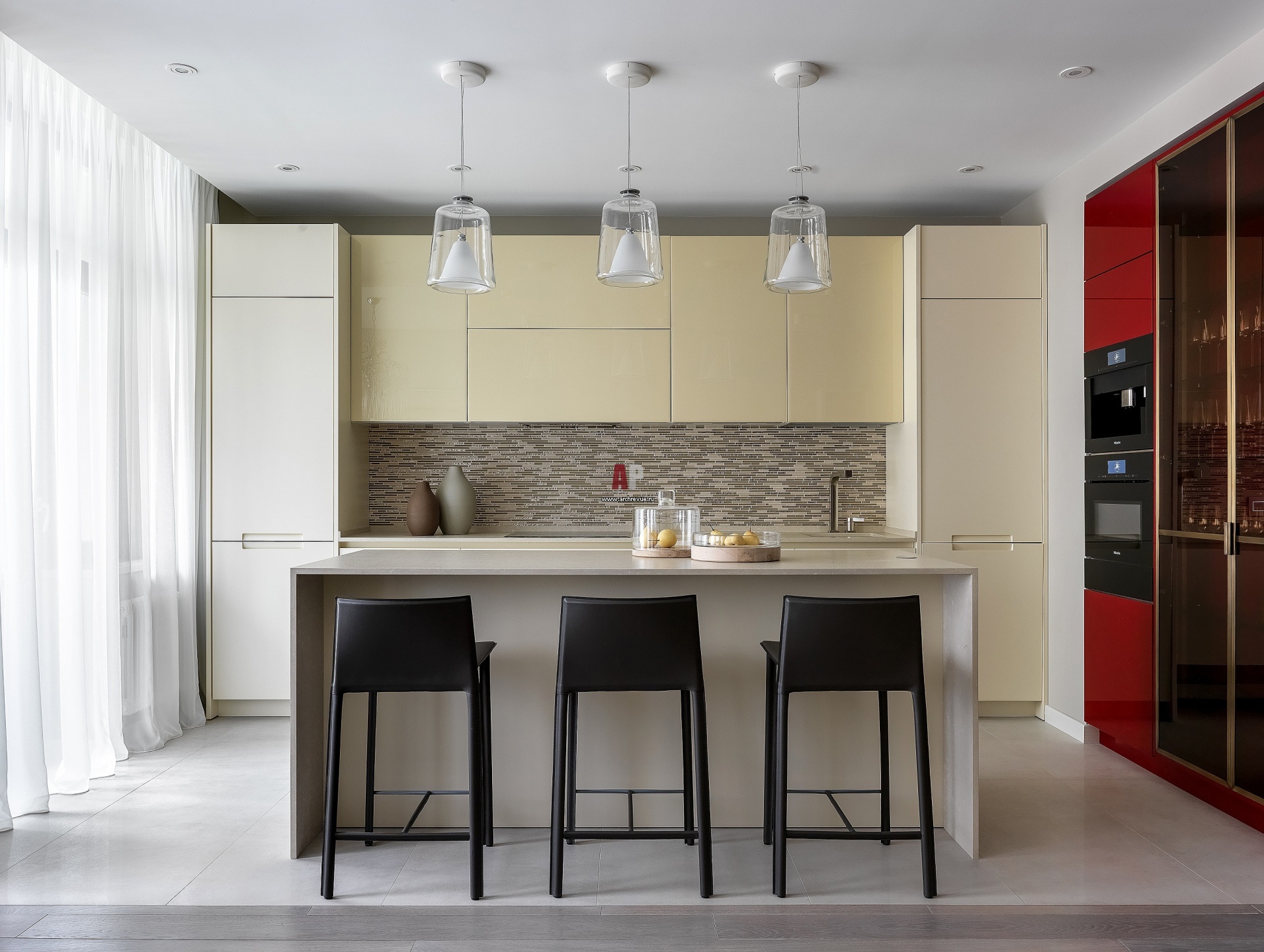 Интерьер кухни. Центральные шкафы выполнены в нейтральной бежевой гамме, боковые колонны и витрина со стеклянными дверцам в латунном профиле решены в цвете спелой клюквы. Кухонная мебель, Cesar. Полубарные стулья, Cattelan Italia.
