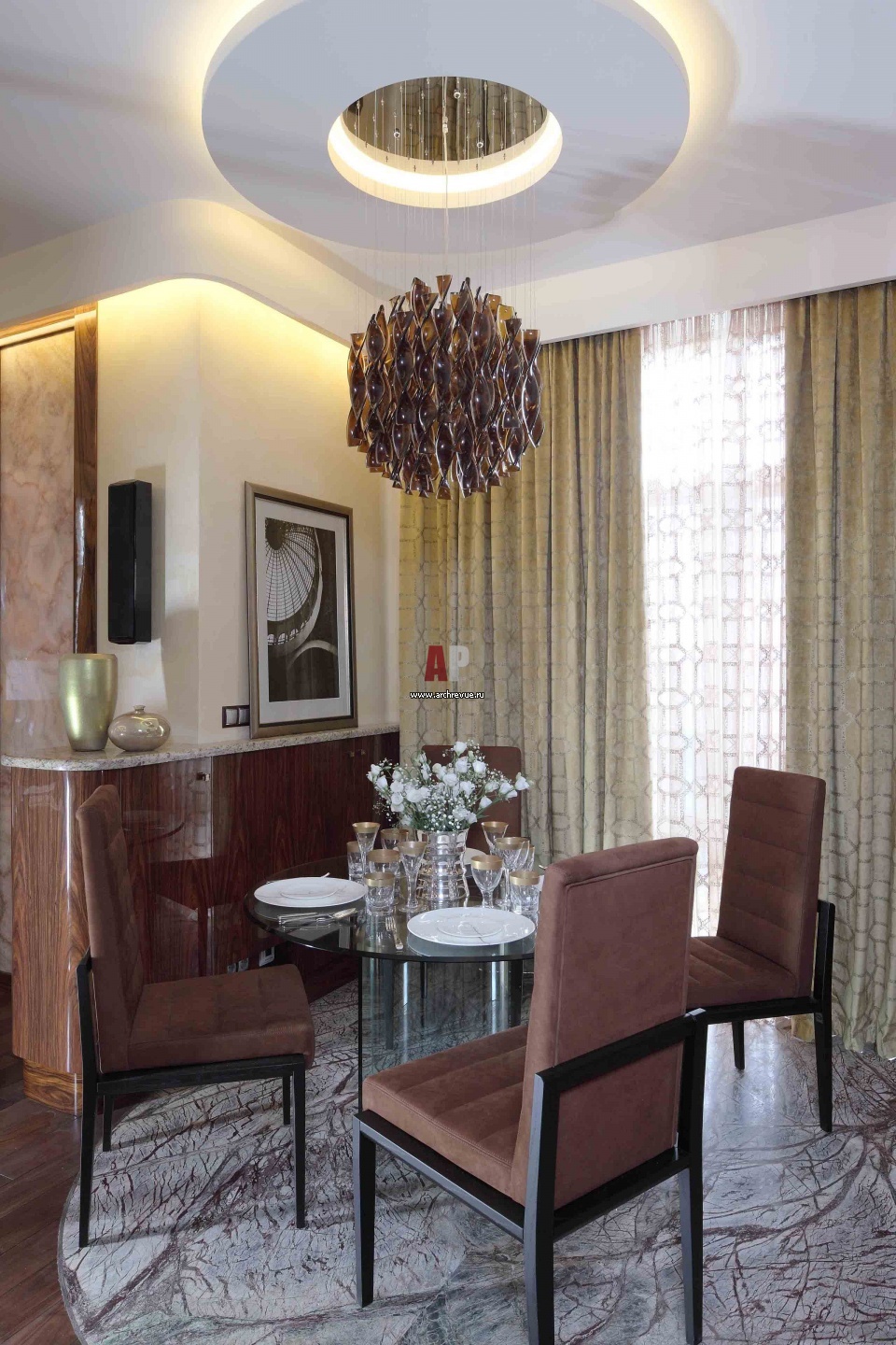 Обеденная зона в гостиной выделена круговым декором потолка. Обеденный стол, Reflex. Стулья, Mobilidea.