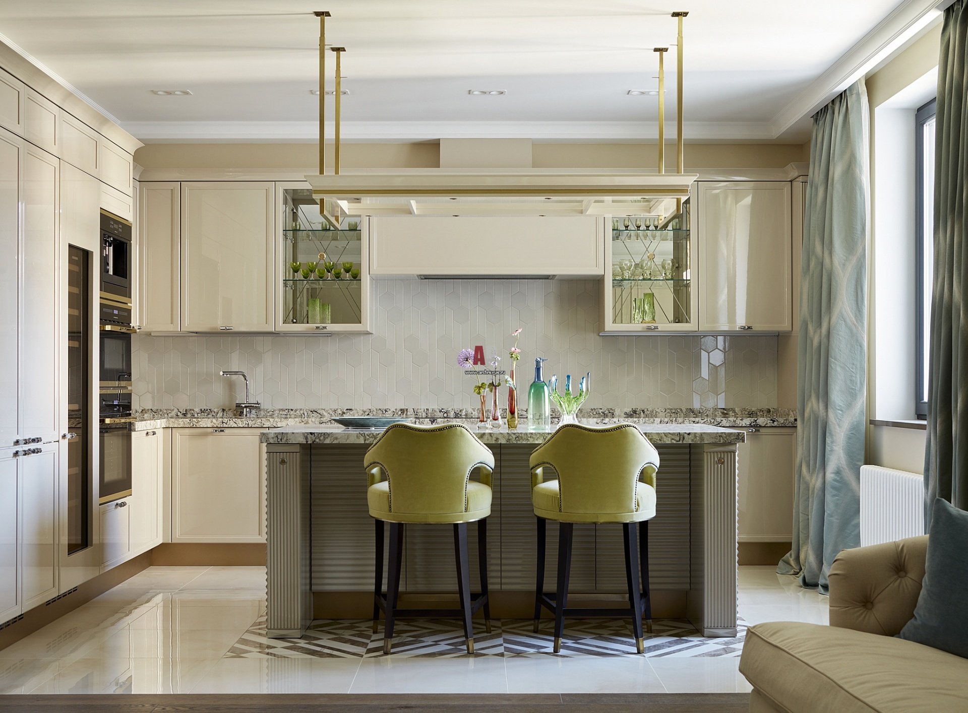 Зона кухни в общей гостиной. Кухня с островом, Aster Cucine. Полубарные стулья, Brabbu в ткани Rubelli. Плитка, Versace.