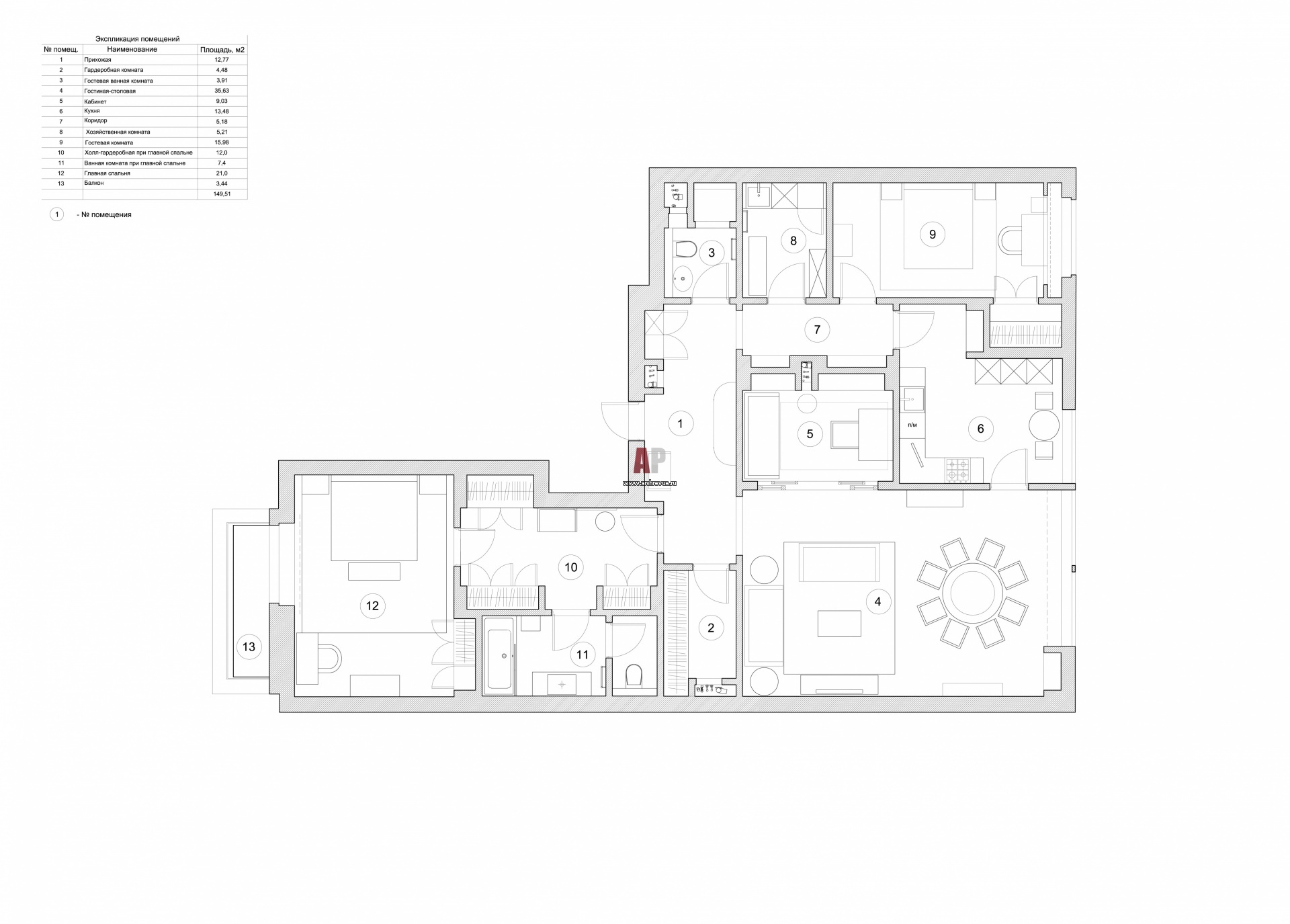 План консервативной квартиры для супружеской пары. Общая площадь - 149 кв. м.