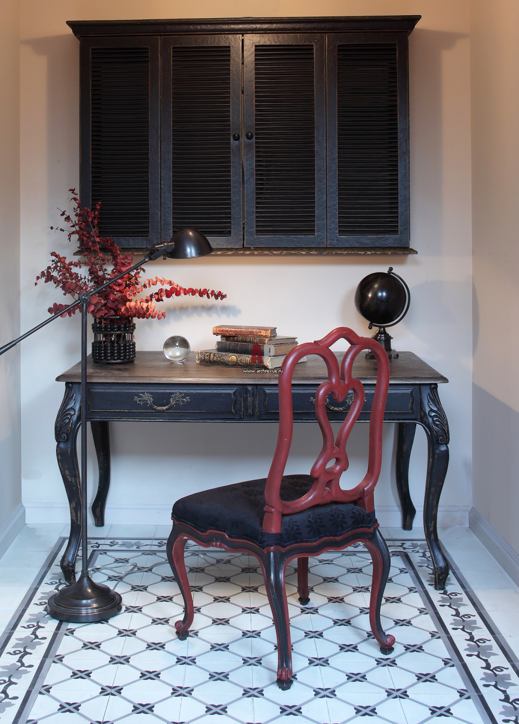 Дизайн интерьера кабинета. На полу – французская цементная плитка CARODECO с орнаментом, похожим на ручную роспись. Формат 20Х20 см, толщина - 16 мм. Поставщик плитки, «Грета Вульф».