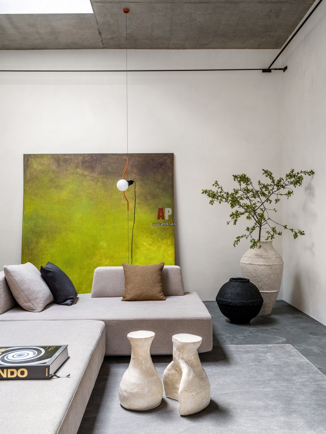 Гостиная. Столики-«обнимашки», Native Ceramics. Вазы, Izzi Decor. Масштабное живописное полотно – работа талантливого тульского художника Романа Устименко.