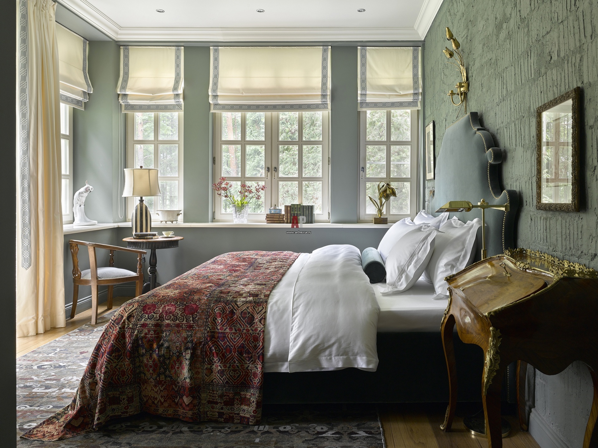 Мастер-спальня. За изголовьем кровати оставлена неоштукатуренная стена с аутентичной кирпичной кладкой, сверху кирпич выкрашен в серо-зеленый цвет.