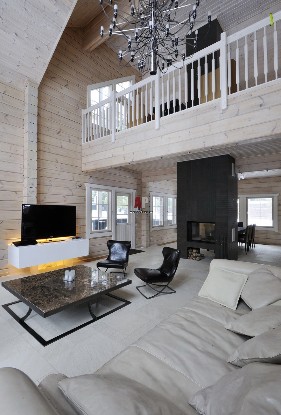 Дизайн двухэтажной гостиной с балконом второго этажа в традициях скандинавского стиля.