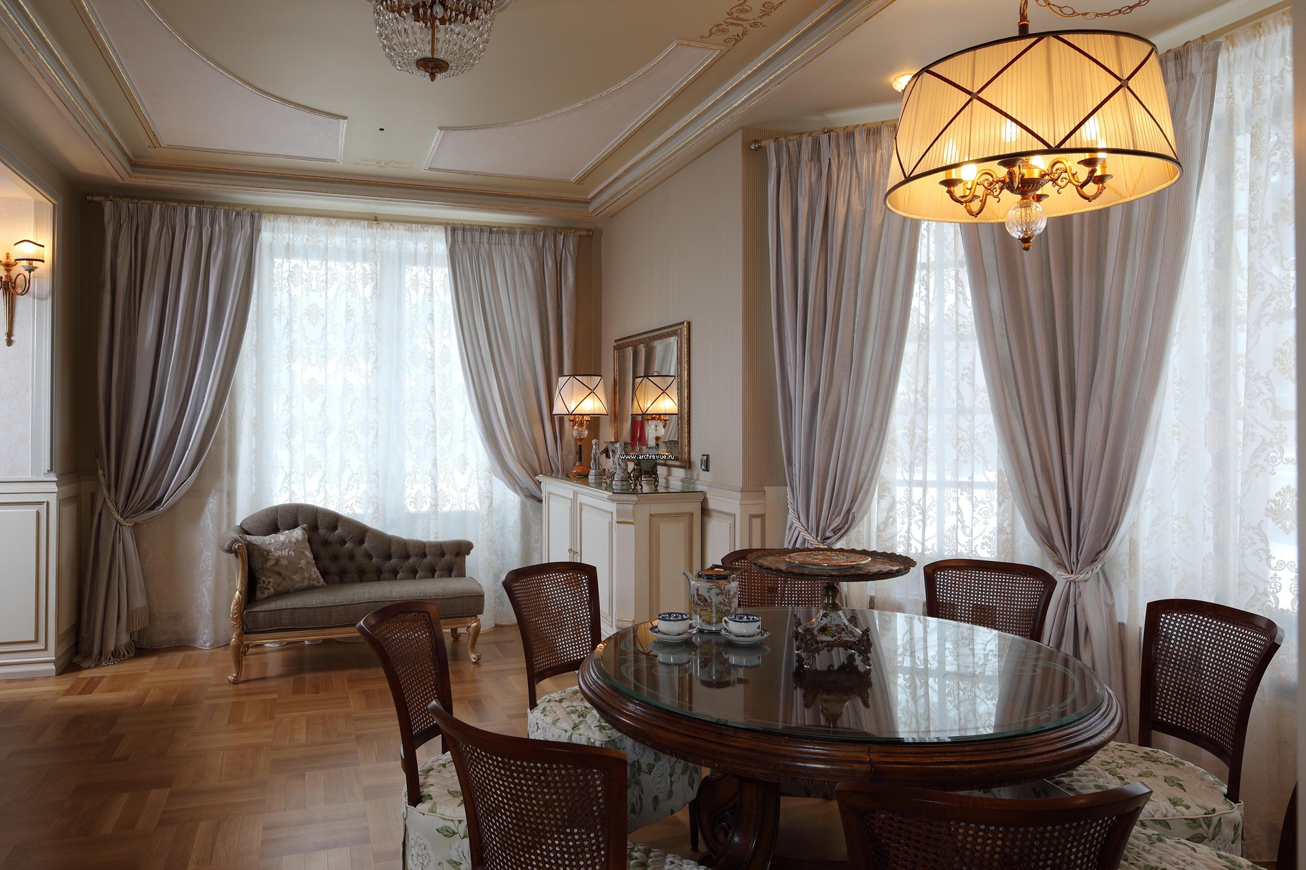 Столовая объединена с гостиной и кухней. Обеденный стол украшен декоративной резьбой, он выполнен на заказ итальянским мастером.