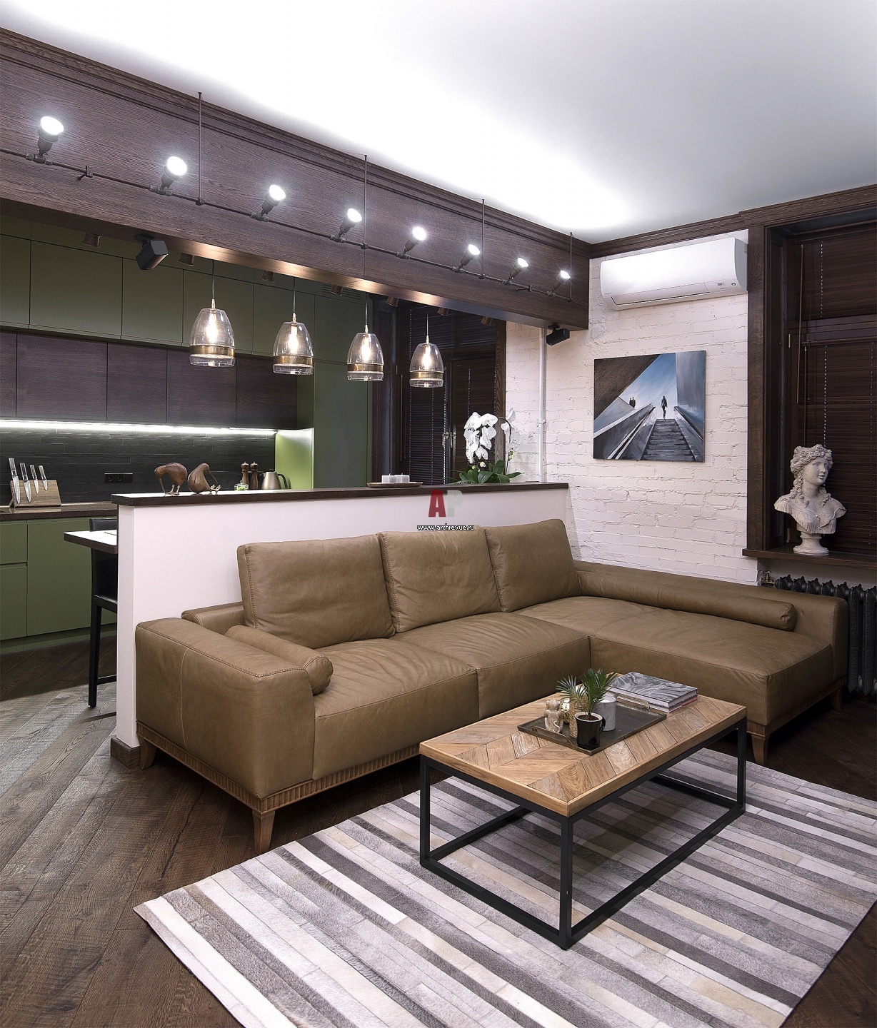 Общая зона мужской квартиры в стиле лофт. На полу – дубовая массивная доска. Кожаный диван, Keoma Salotti.