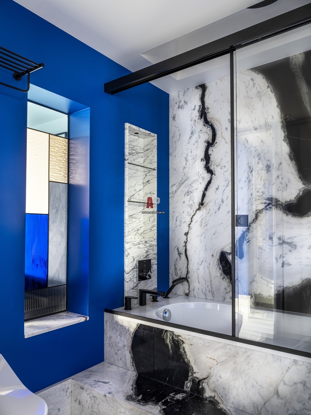 Окно в синей ванной оформлено цветным витражом с разной фактурой стекла.