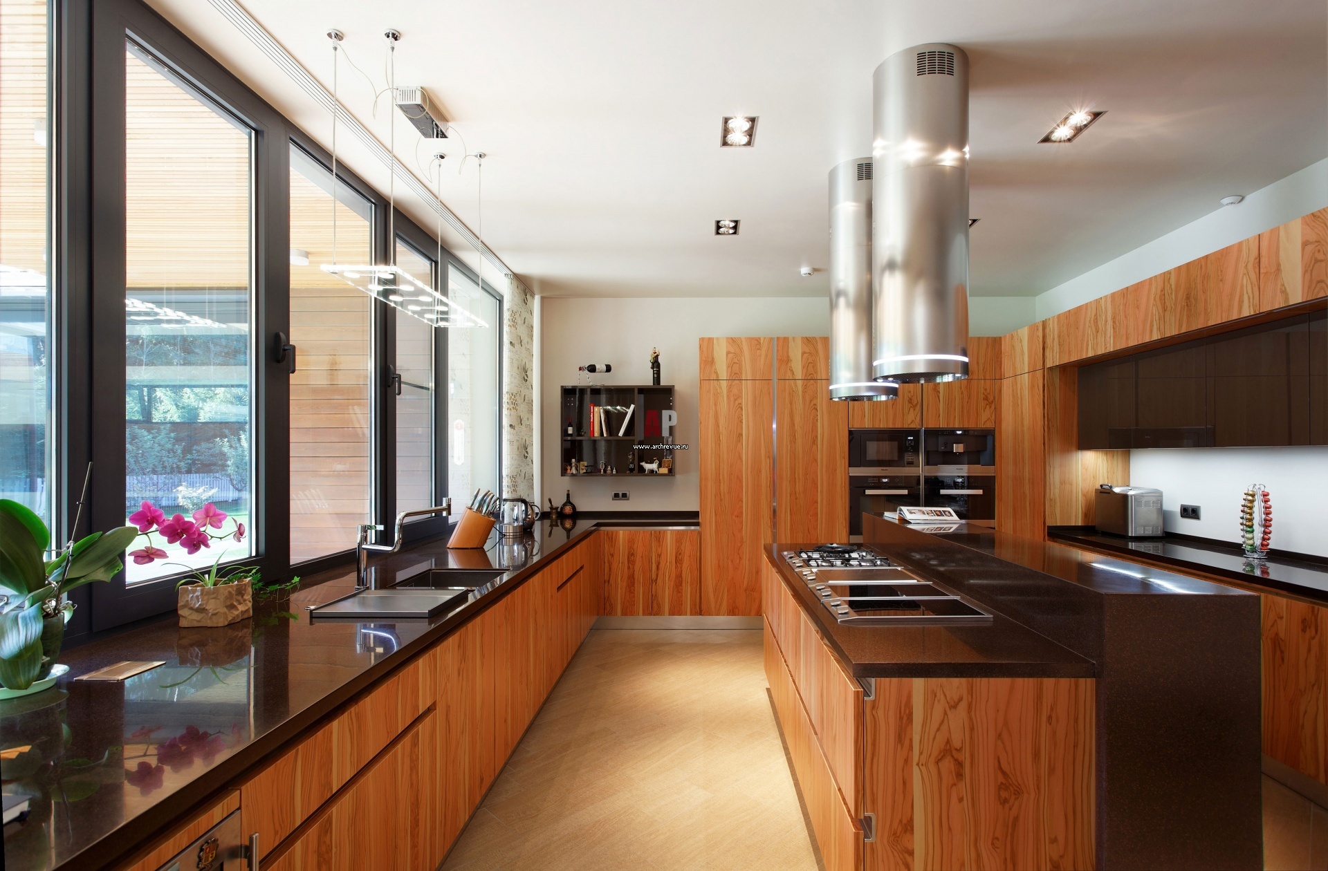 Кухня отделена от общей зоны перегородкой. Фасады кухонного гарнитура отделаны шпоном из ценных пород дерева.