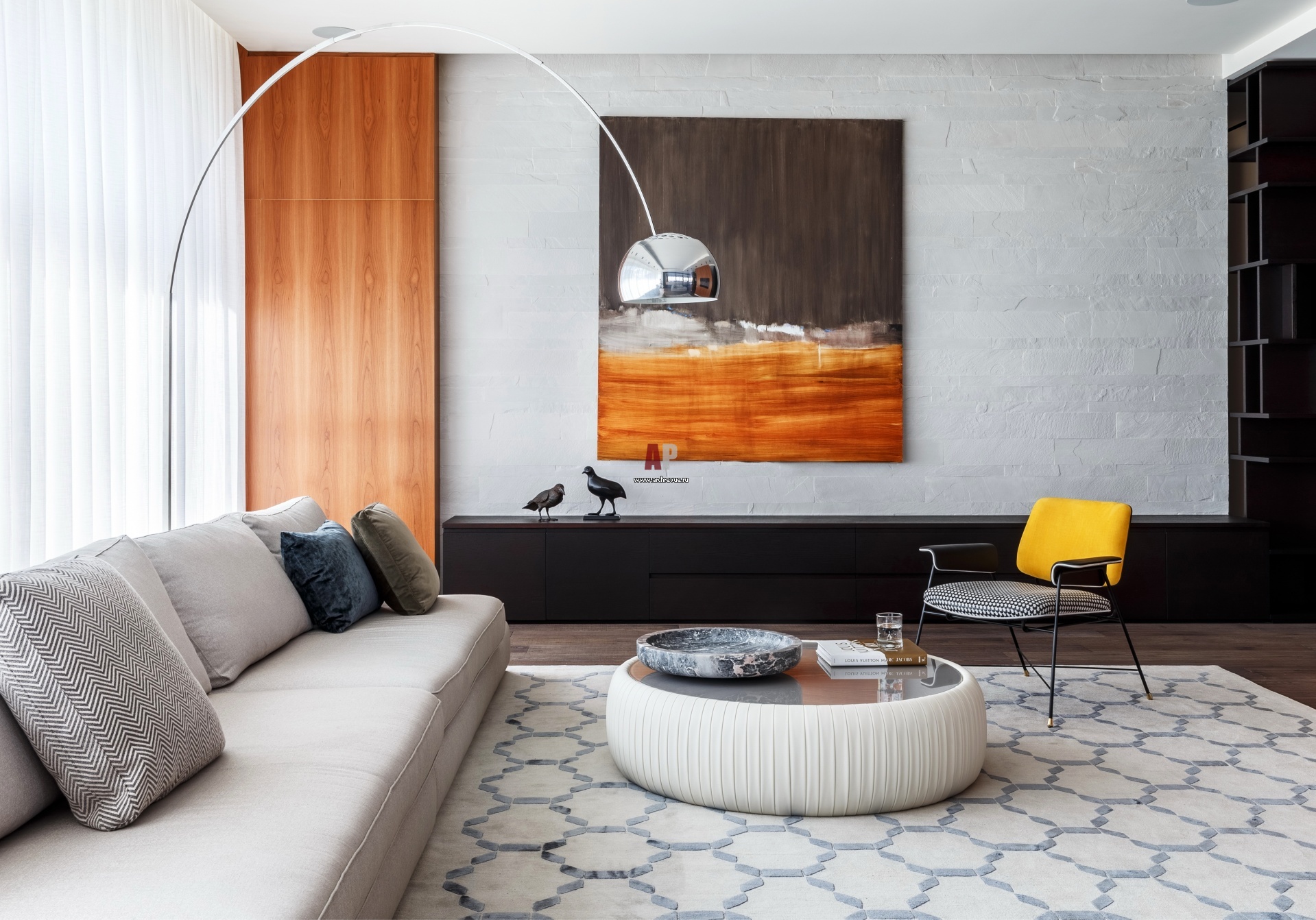 Семейный пентхаус в Хамовниках. Интерьер диванной группы в общей гостиной. В отделке стены белый колотый камень сочетается с панелями из вишни насыщенного цвета.