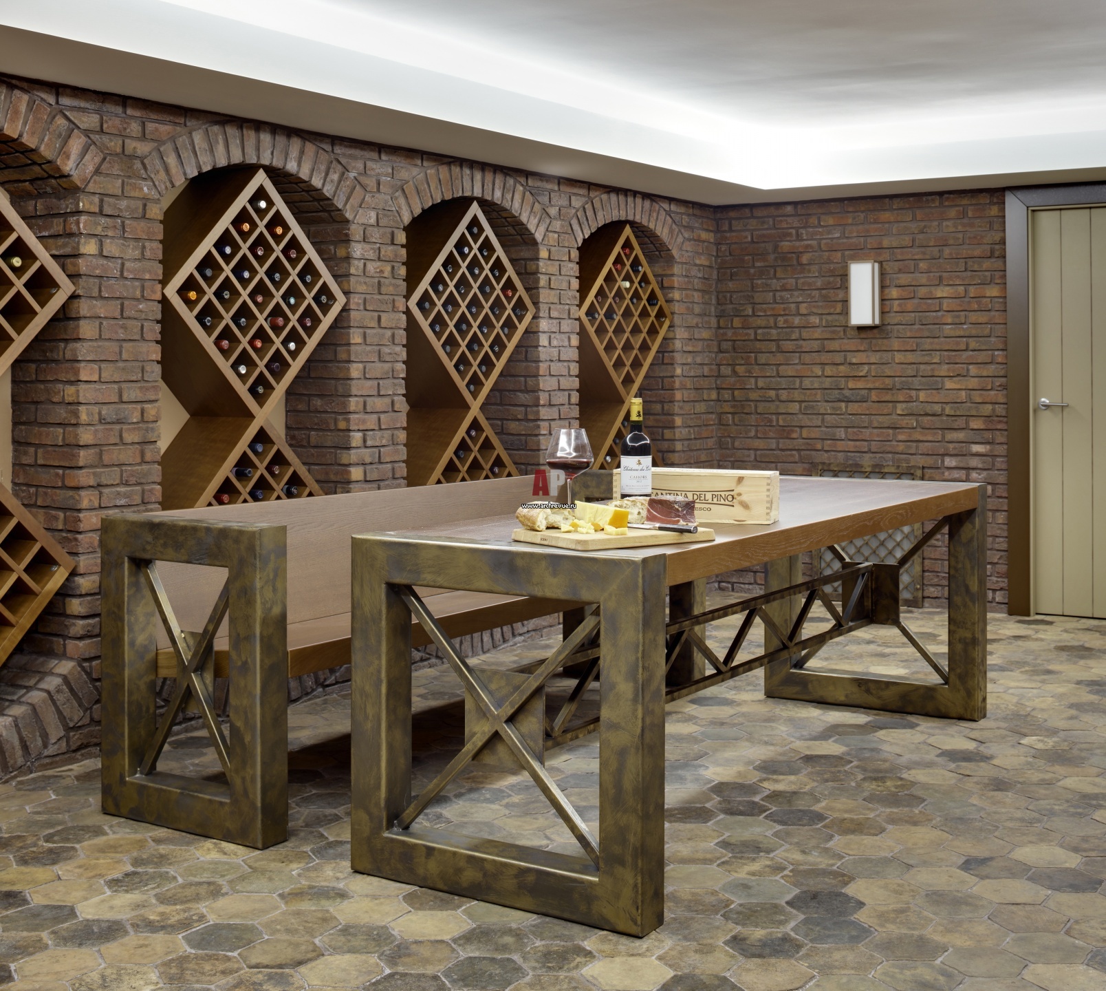 Подвальный этаж оформлен в стиле лофт. На полу проходных помещений и винного погреба историческая плитка XIX века в форме многогранника.
