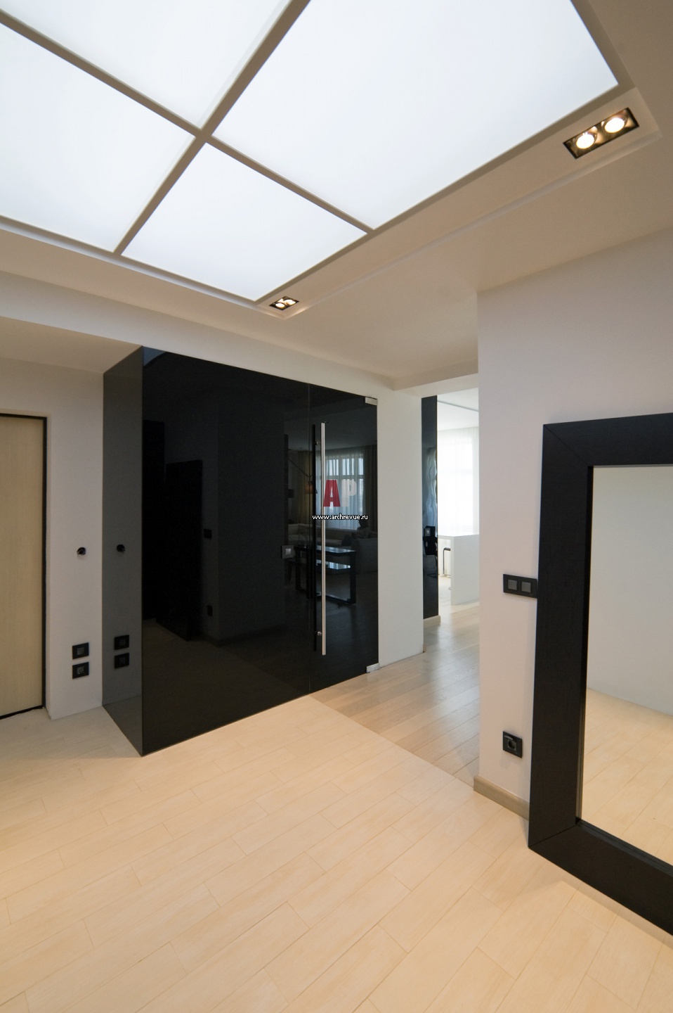 Фото интерьера прихожей в стиле минимализм. Дизайн интерьера строится на контрасте белых стен и потолка из матового стекла с черным глянцевым гардеробным шкафом и антрацитовым обрамлением напольного зеркала.