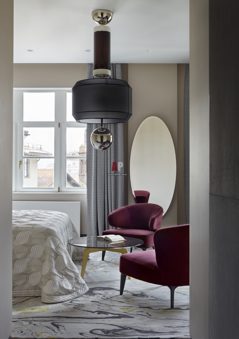 Современная квартира с полудрагоценным агатом и темным деревом. Интерьер спальни. Акцентная черная люстра, Italamp, модель Odette Odile.