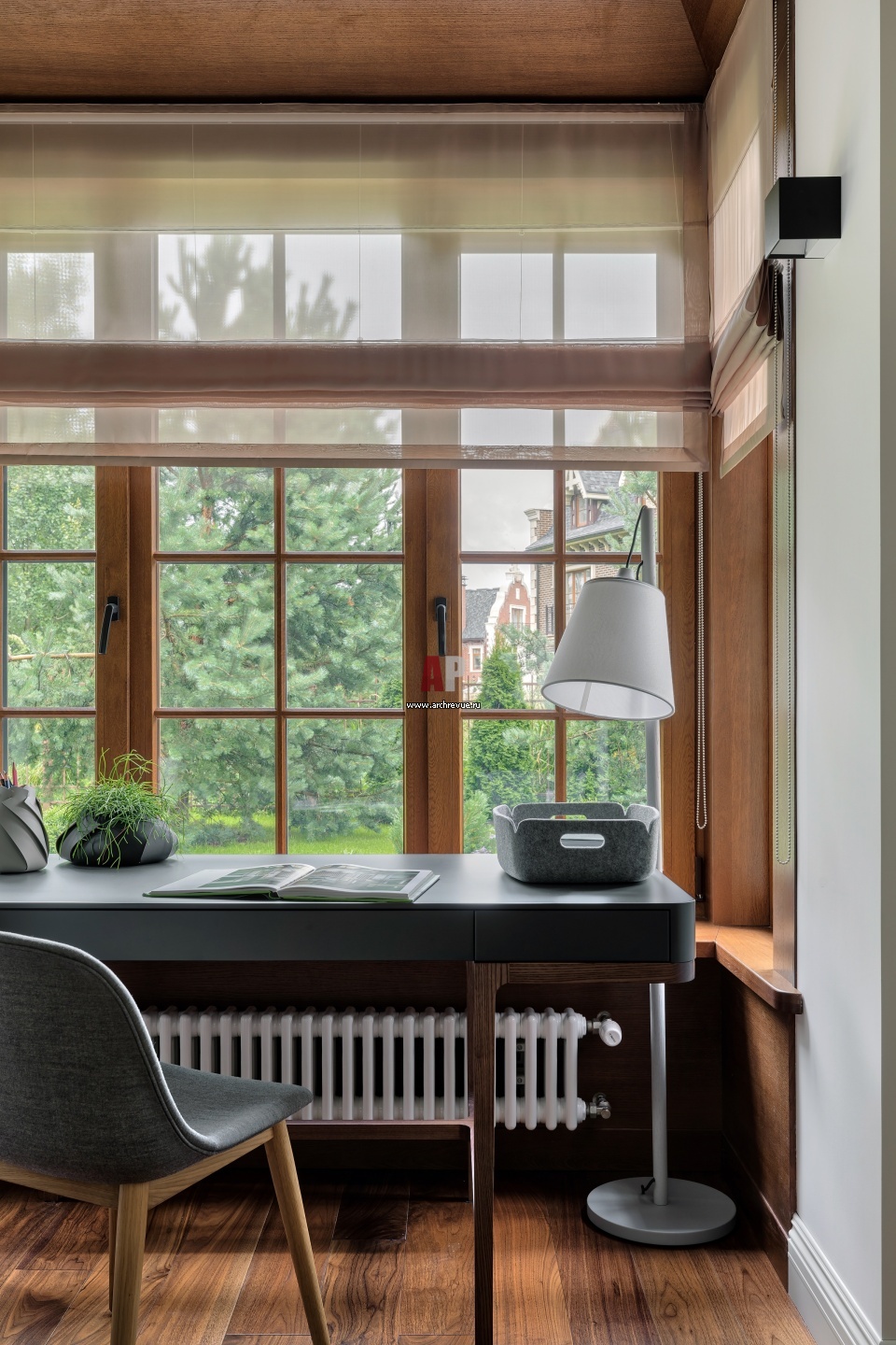 Кабинет. Эркеры во всем доме зашиты панелями из шпона американского ореха. Стол письменный, Lema.