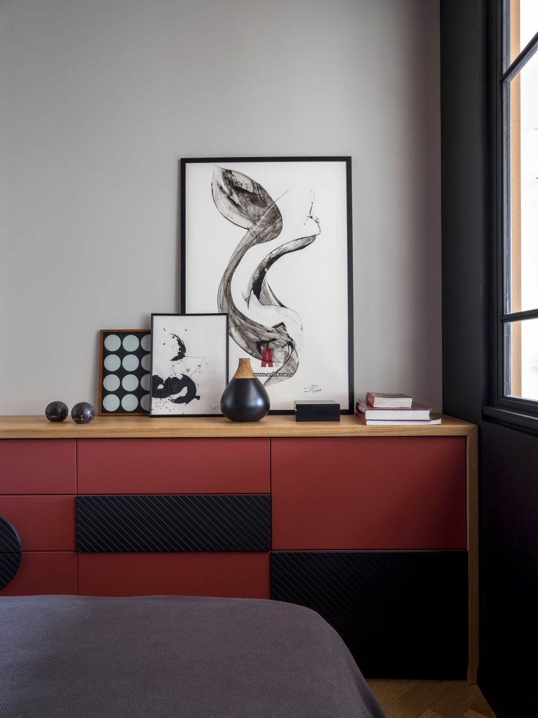 Брутальная квартира с отсылками к Ле Корбюзье и Питу Мондриану для девушки. Интерьер спальни.
