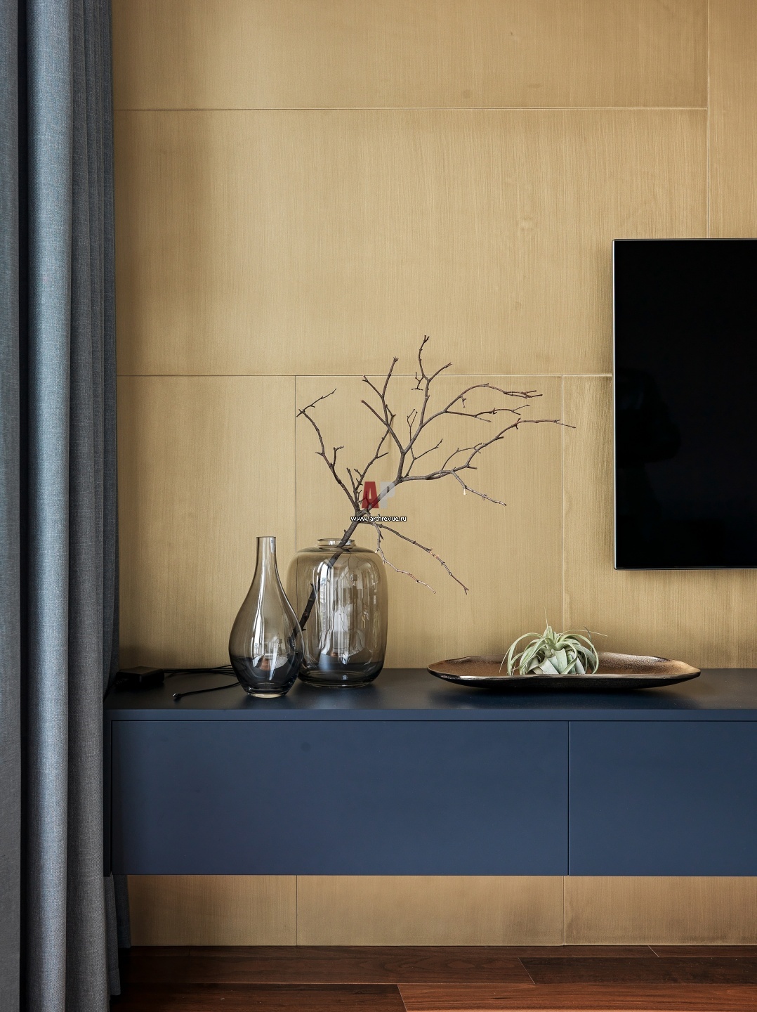 Сияющая тусклым золотом стена в гостиной зашита латунными панелями.