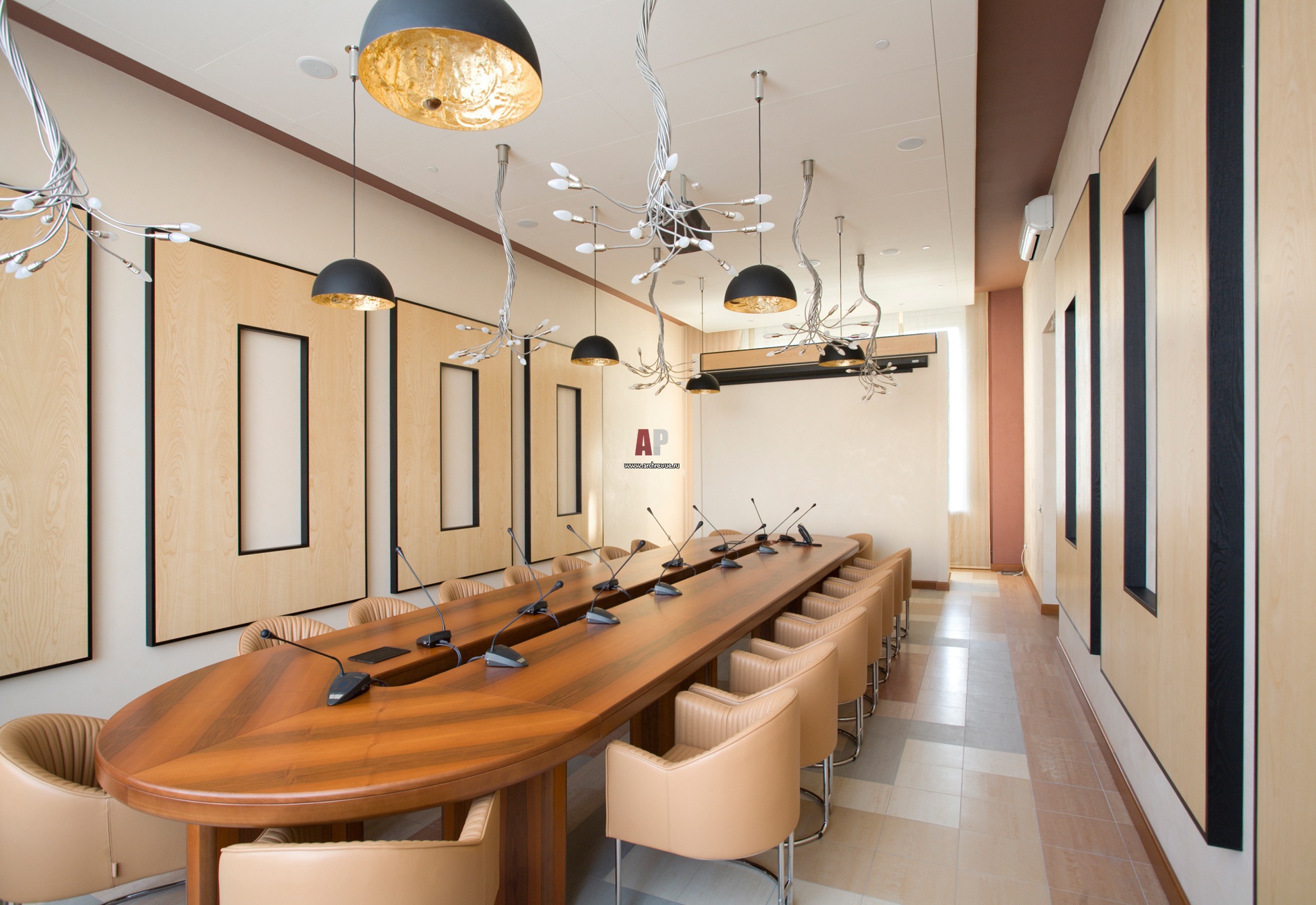 Стены главной переговорной оформлены декоративными рамами из светлого дерева. За причудливыми светильниками на потолке скрывается видеопроектор.