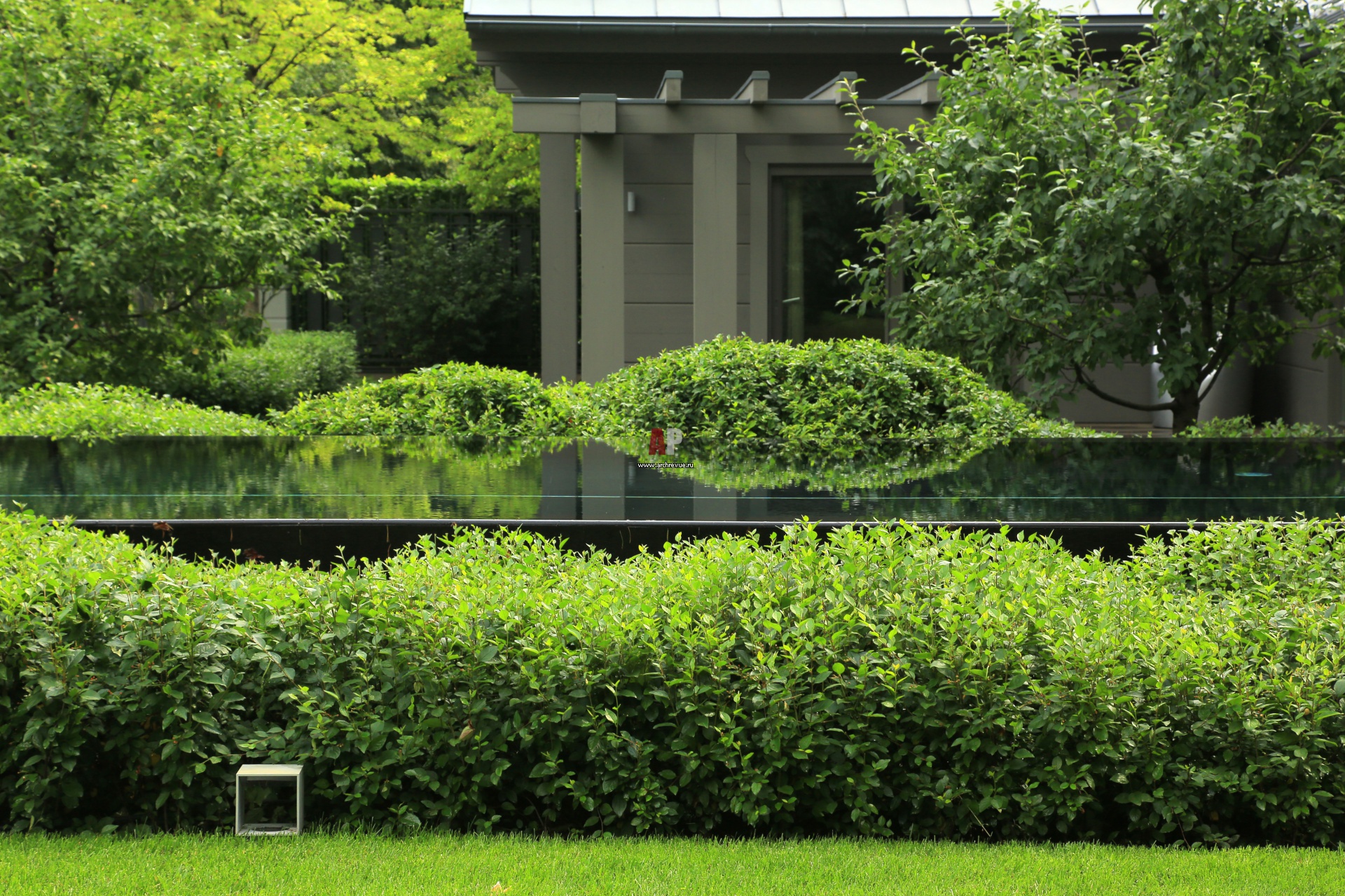 Дизайн ландшафт классической усадьбы с водоемом в обрамлении кизильника.