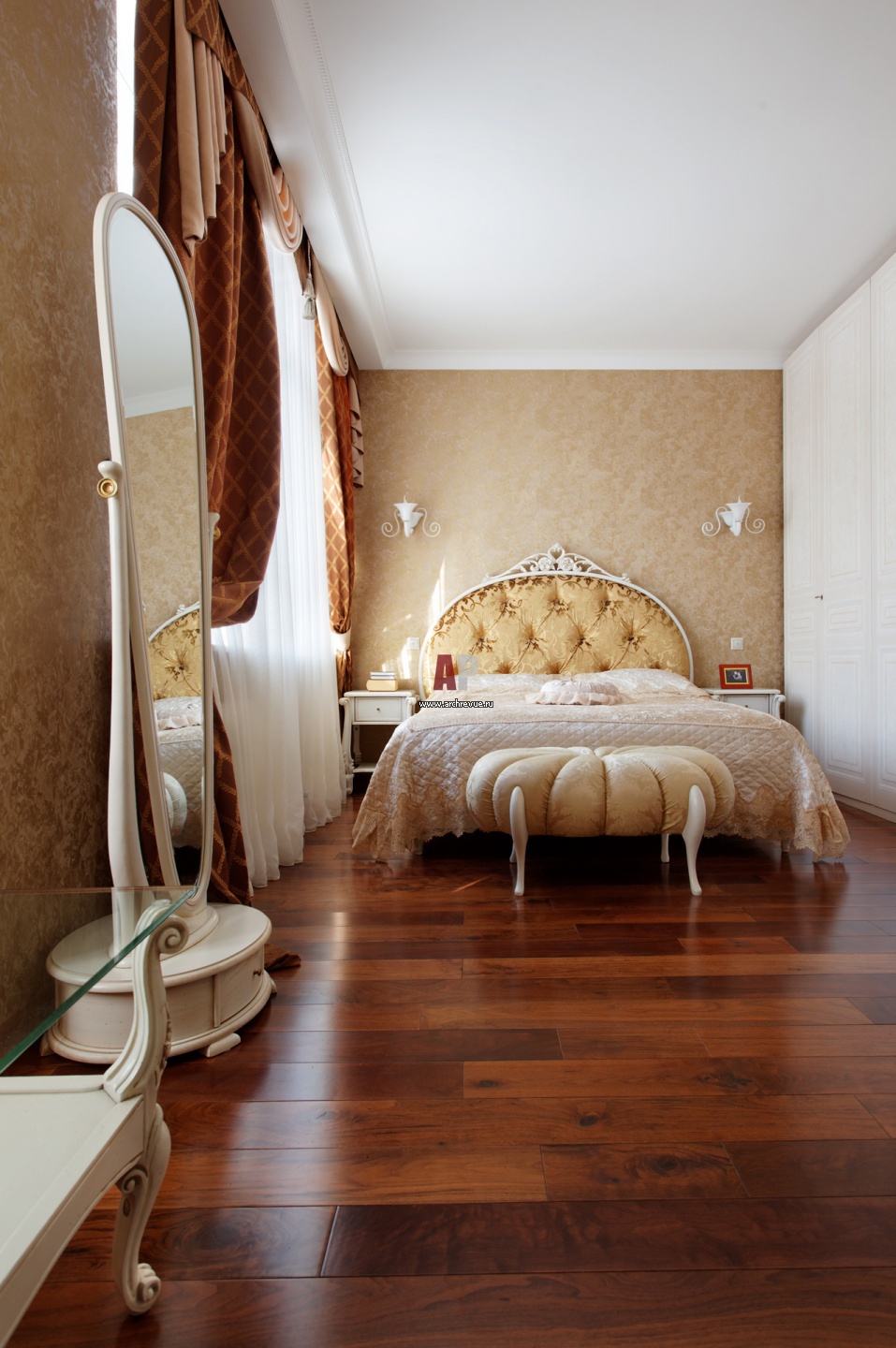 Интерьер спальни в неоклассике. На стенах – обои с золотистым оттенком. Мебель Volpi в белой отделке. Изголовье кровати из шелка.