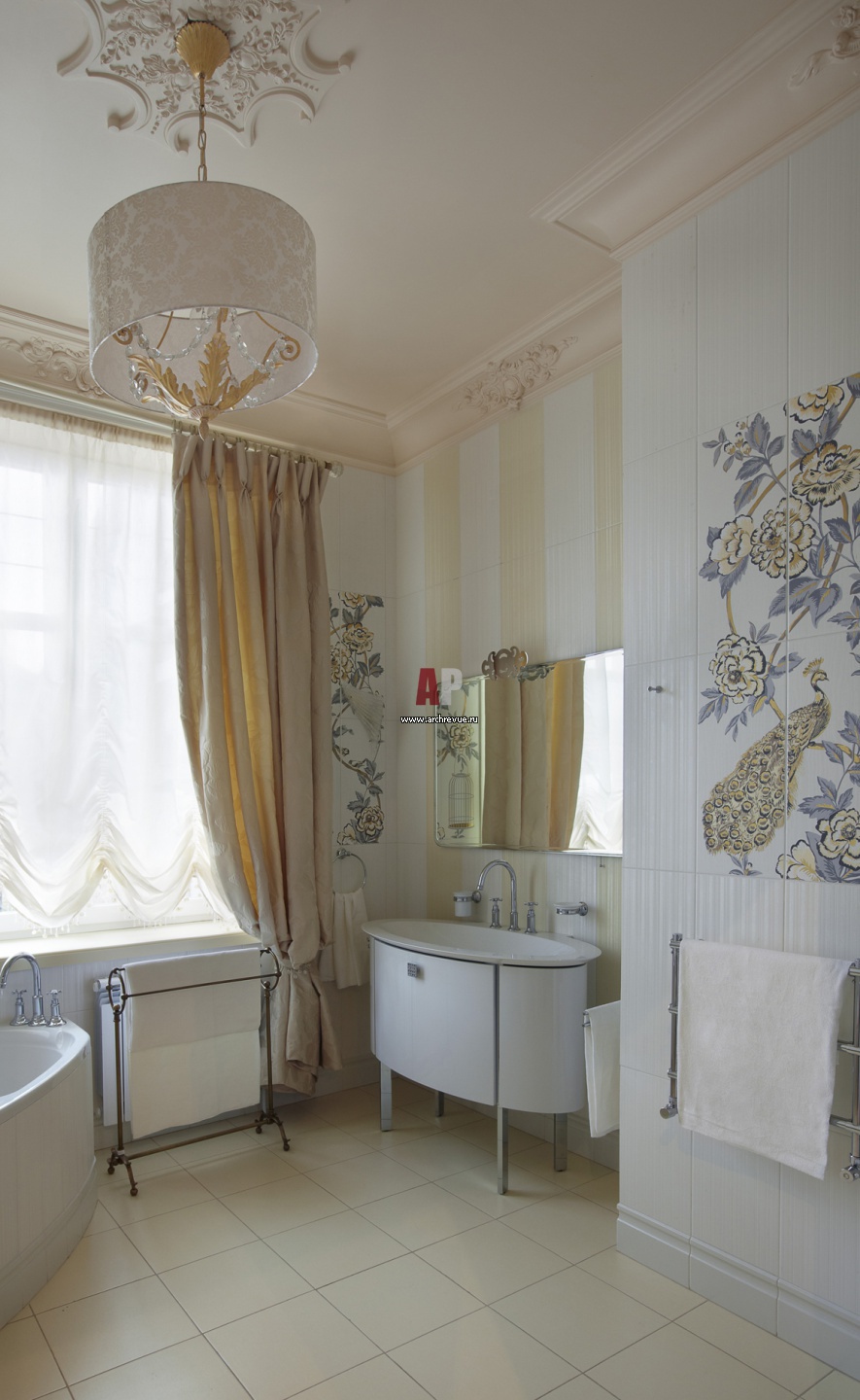 Ванная решена в бежево-молочной цветовой гамме. Стены декорированы плиткой с изображением павлинов, поставщик «Аквафорум».