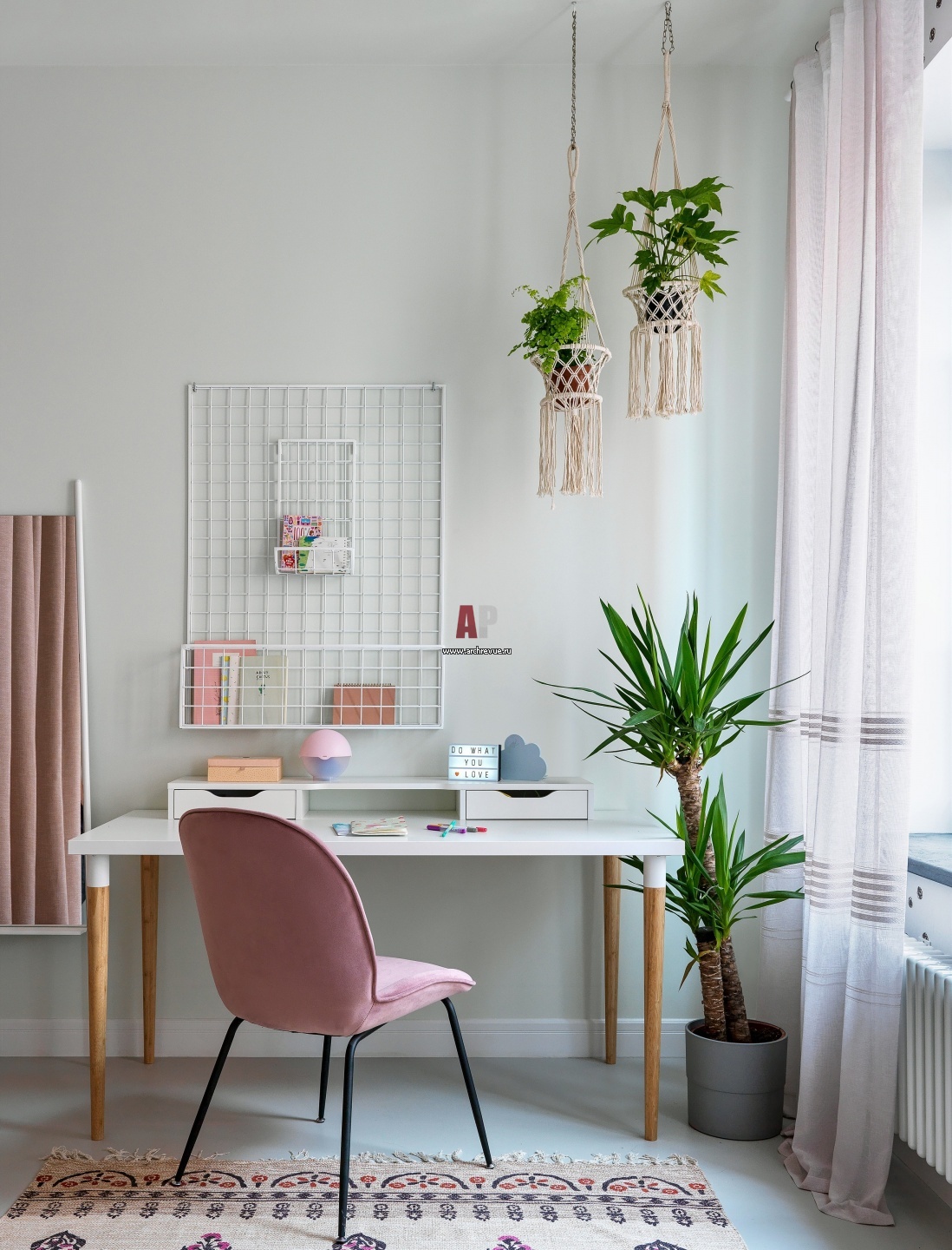 Рабочее место в комнате дочери. Настенный органайзер сделан из металла.