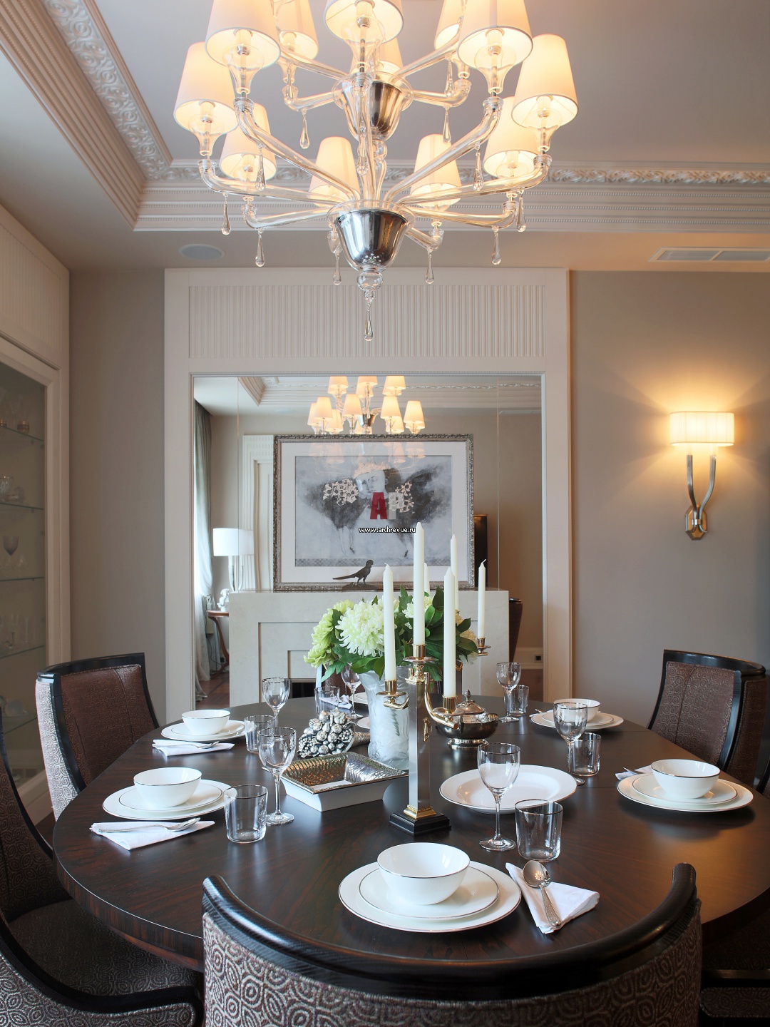 Рядом с обеденным столом размещена каминная группа. Портал биокамина выполнен из светлого мрамора, плоскость за ним облицована зеркалами и обрамлена декоративным порталом из дерева с белым эмалевым финишем. Его форма повторяет отделку межкомнатных дверных порталов. Люстра, Barovier & Toso.