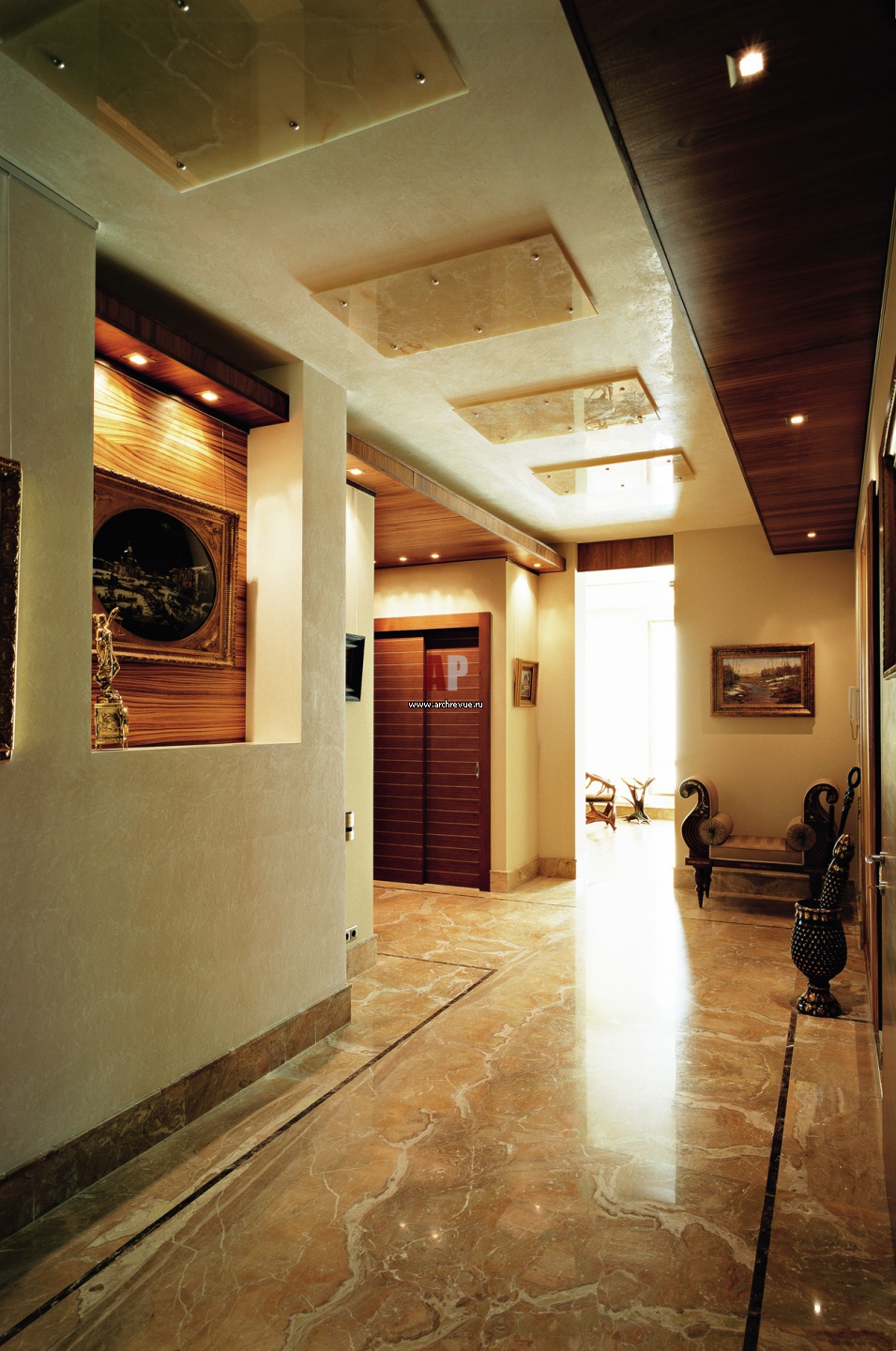 Коридор декорирован нишами, в которых выставлена коллекция старинных предметов и оружия. Потолочные светильники представляют собой квадратные плиты натурального оникса на металлических шурупах, поставщик «Группа MODUL».
