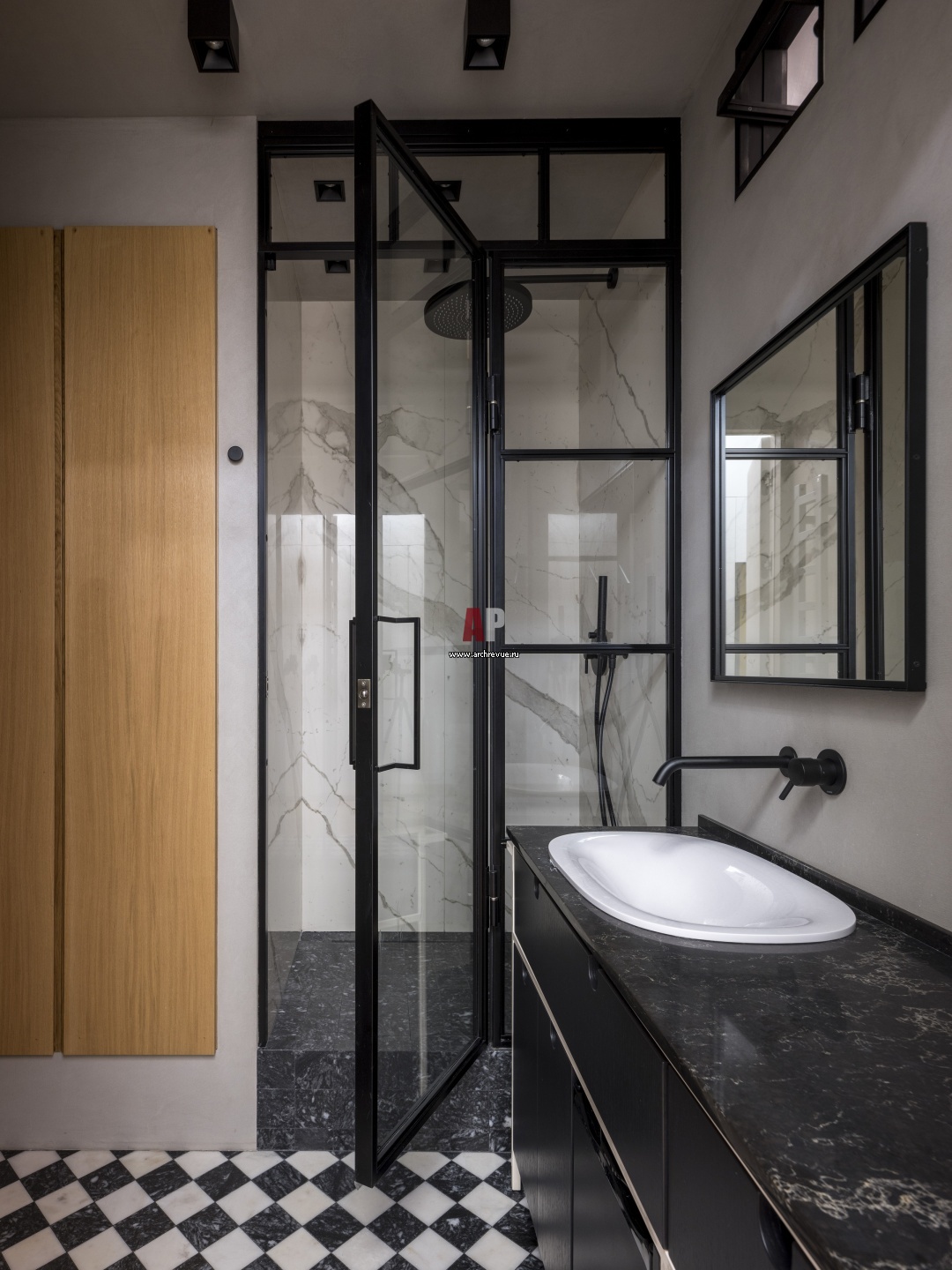 Интерьер санузла в брутальном стиле. Душевая перегородка сделана на заказ, стекло черный металл. На полу – графичная мозаика из натурального камня по рисунку автора проекта.