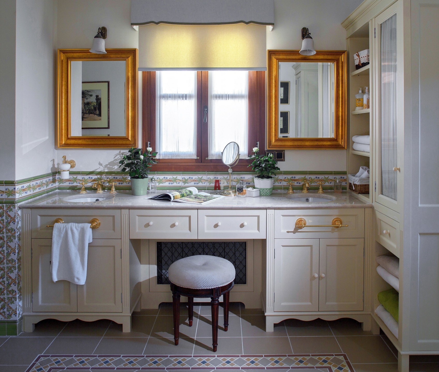 Интерьер дома с испанским колоритом. Интерьер ванной комнаты. Низ стен облицован изразцовой майоликовой плиткой. На полу - испанская цементная плитка с орнаментом.