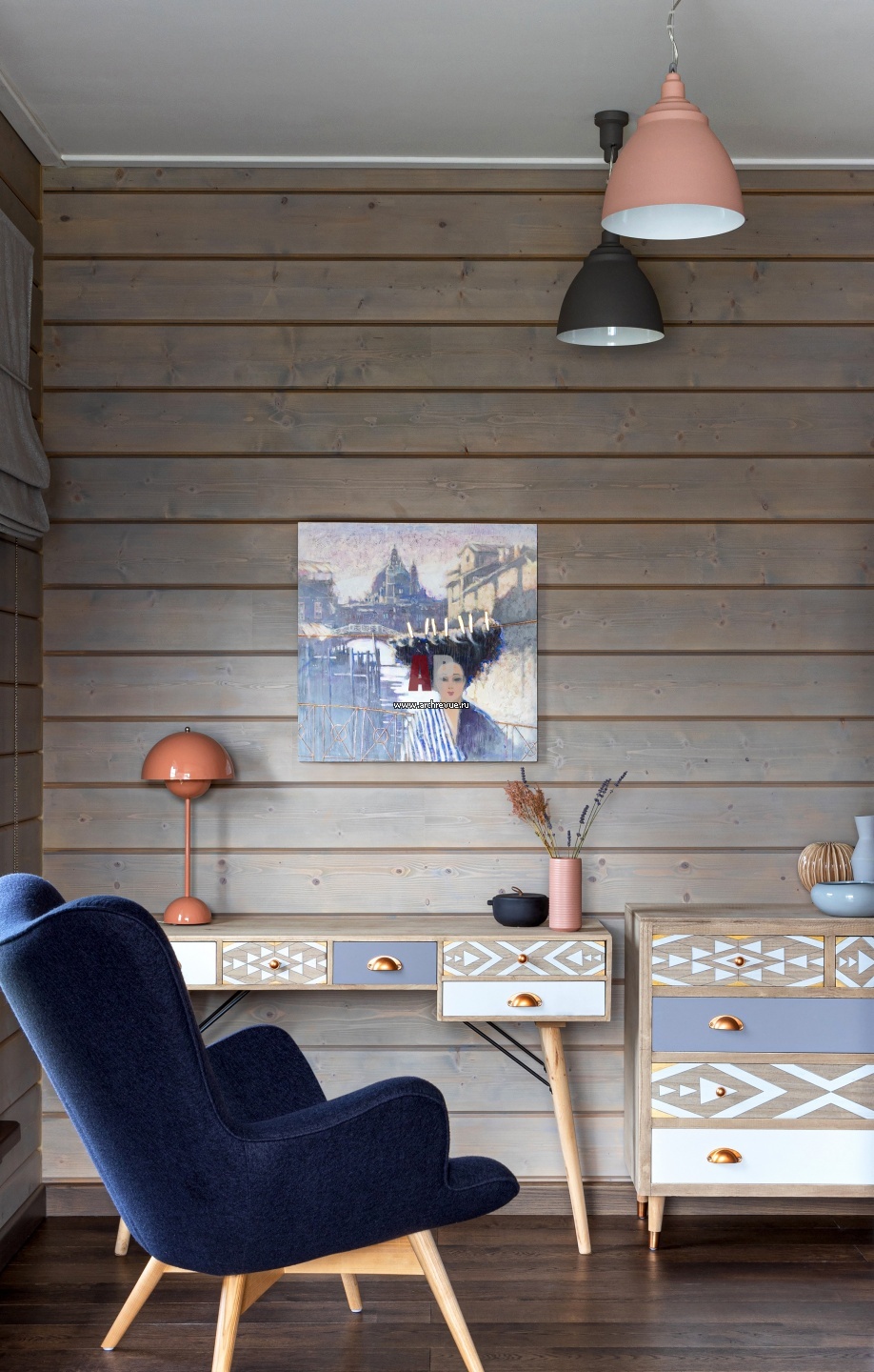 Деревянный дом на Истре. Интерьер женского кабинета. Кресло, стол, комод, Kare Design.