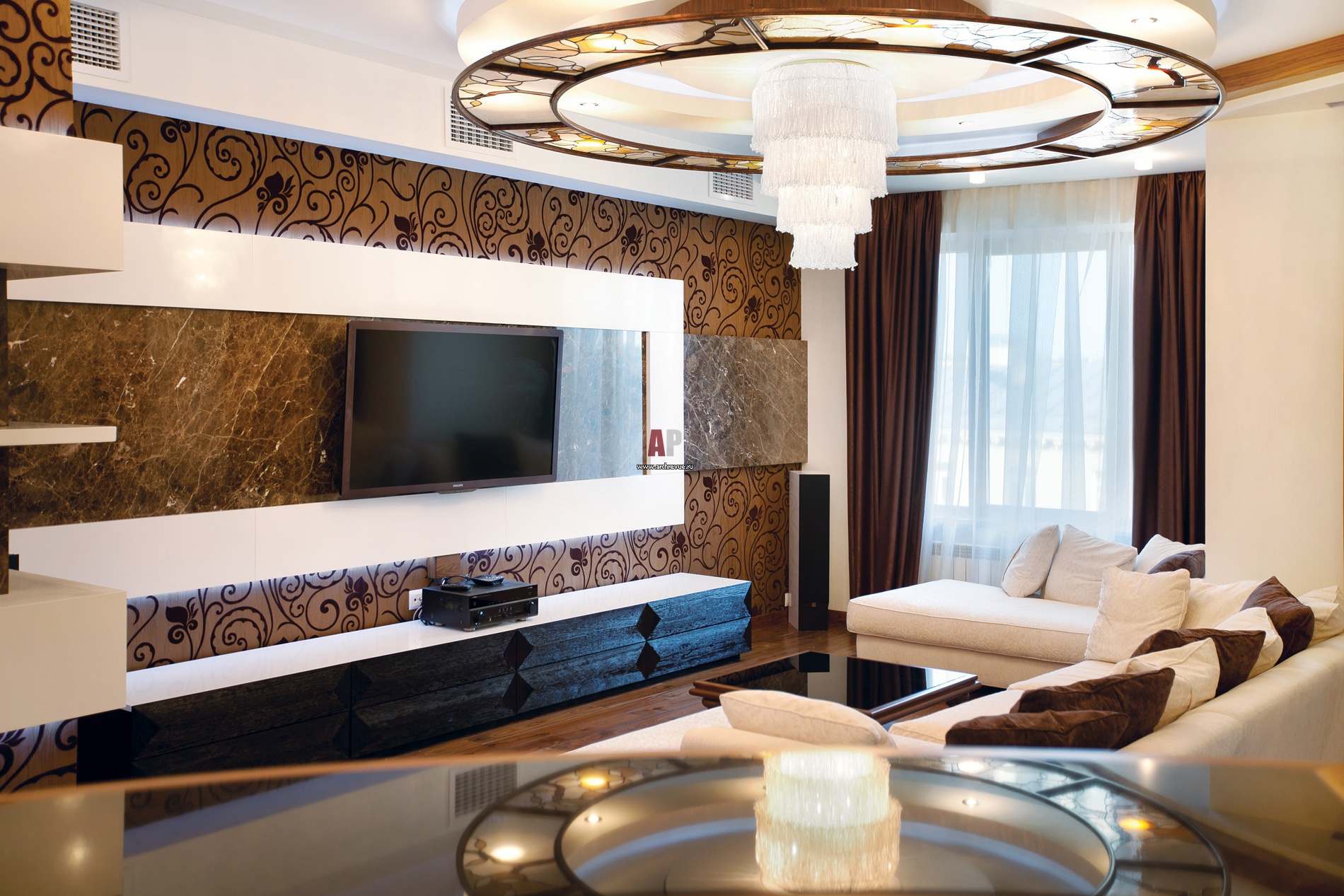 Зона домашнего кинотеатра. Зона ТВ оформлена динамичной композицией из слэбов мрамора и лакированного белого дерева.