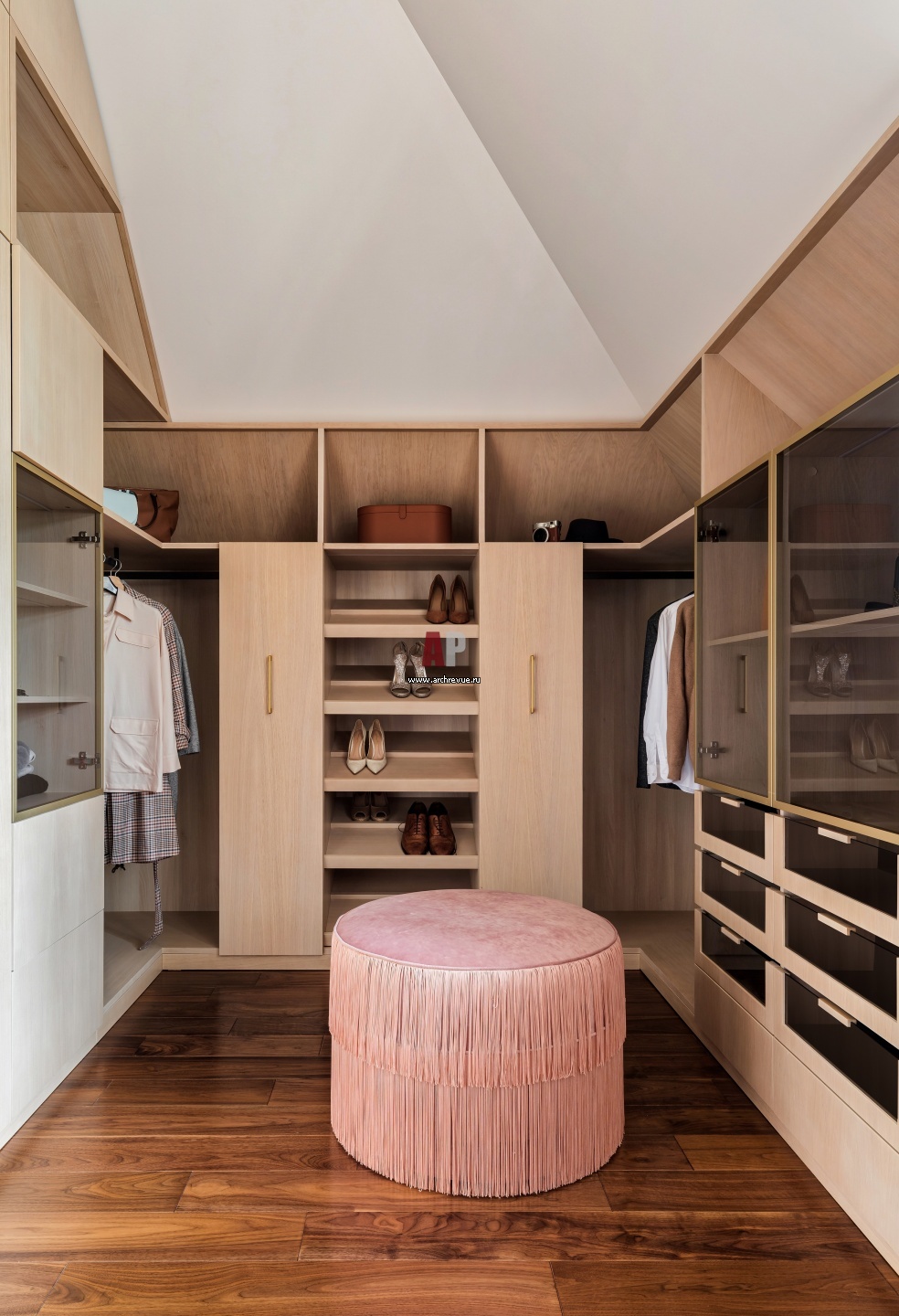 Гардеробная хозяйки дома. Шкафы, на заказ. Розовый с бахромой пуф, Munna.